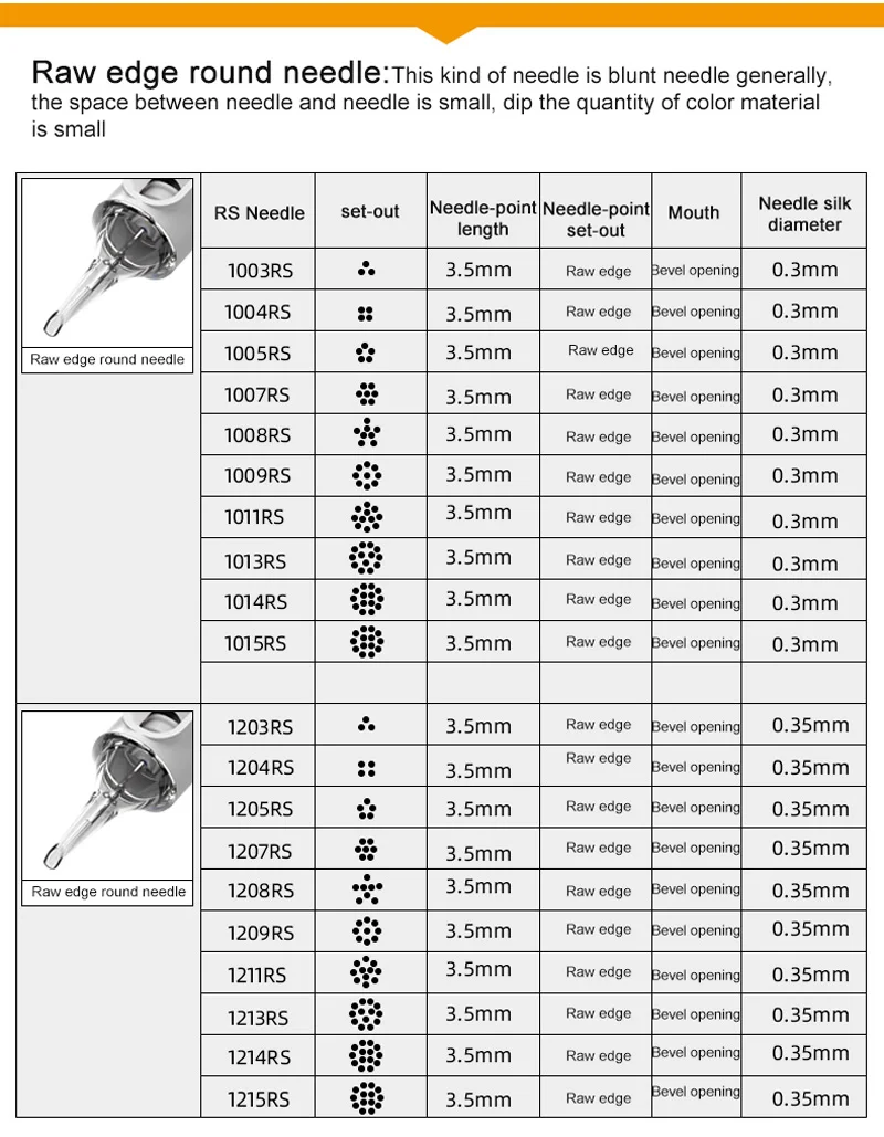 1. Иглы для татуировочных картриджей изготовлены из точной формы, обладающей низким уровнем шума, они окажут отличную помощь профессиональному татуировщику. 2. RL/RM/M1/RS четыре дополнительных типа с несколькими размерами подойдут для различных игл для татуировок. 3. Более того, одноразовый материал быстро меняется и обеспечивает идеальную, несложную и гигиеничную работу.