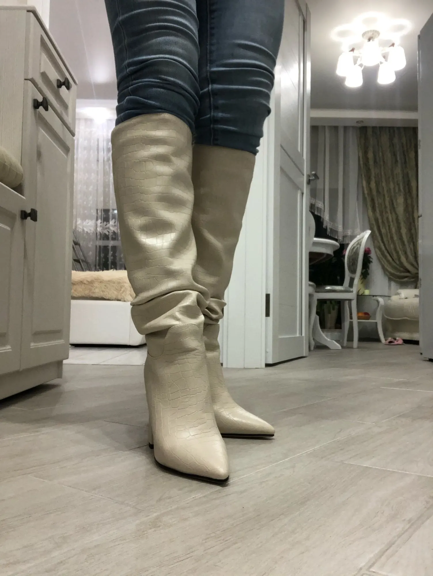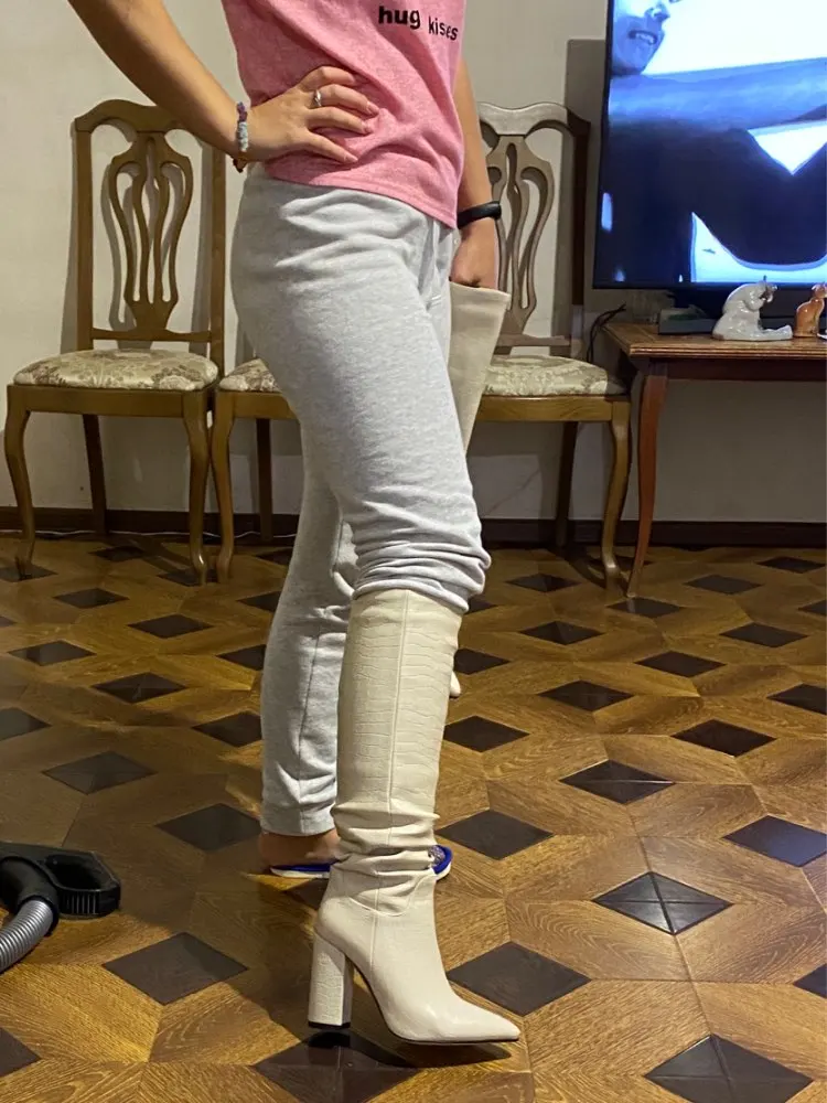 Сапоги хорошие. Голенища на узкую ногу хорошо как надо. На рост 1,5м до колен. Каблук высокий, но удобный. На стопу 21,5 размер 3,5 большеват. Положила стельку зимнию и стало плотнее. Ходить нужно осторожно, чтобы не ободрать носы.