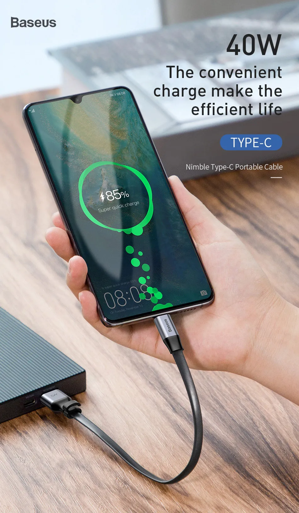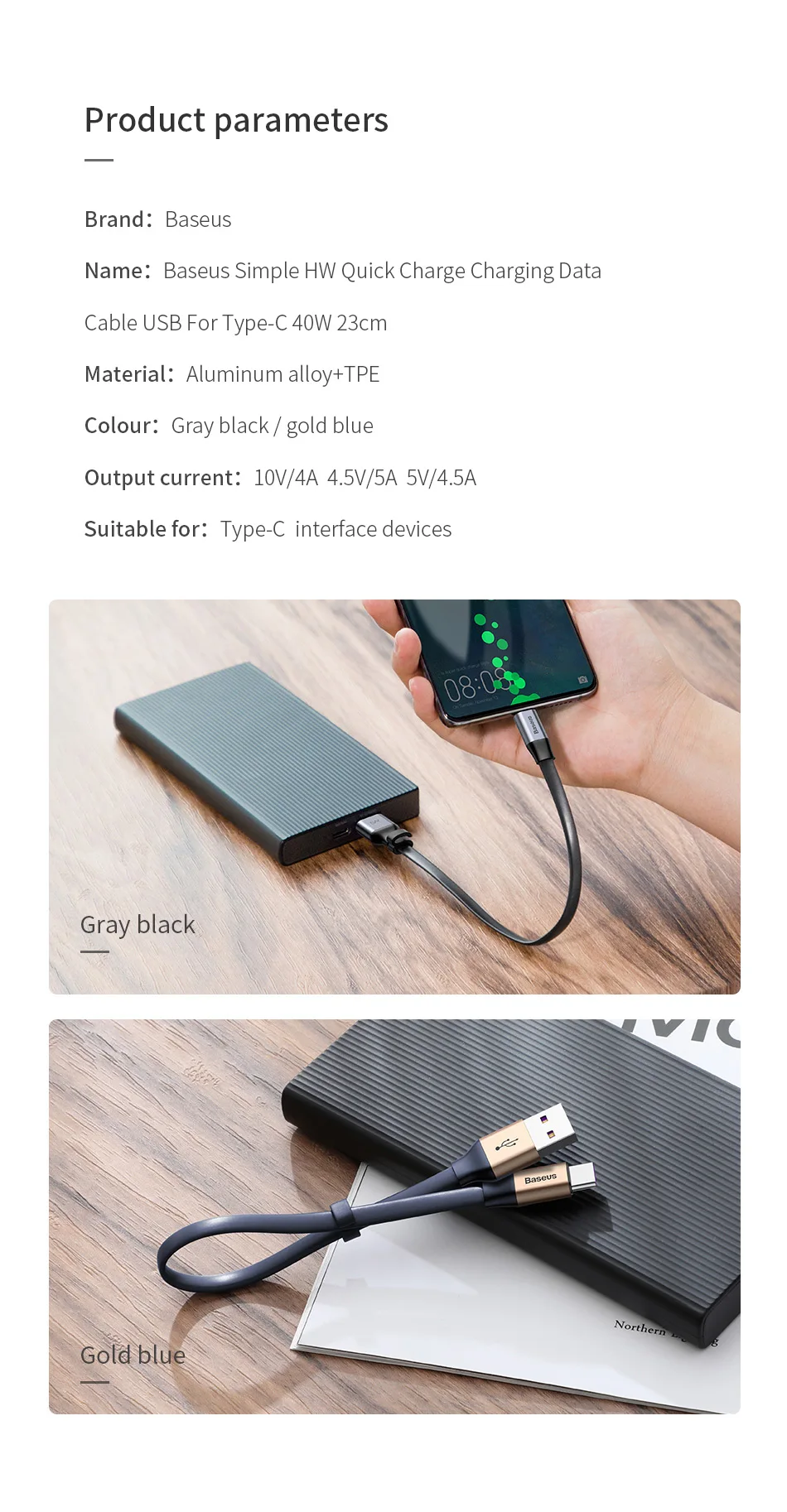 Кабель Baseus usb-c, 40 Вт, 5 А, 23 см, для Huawei P30, P20, Mate 3...