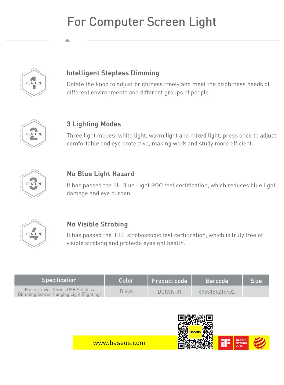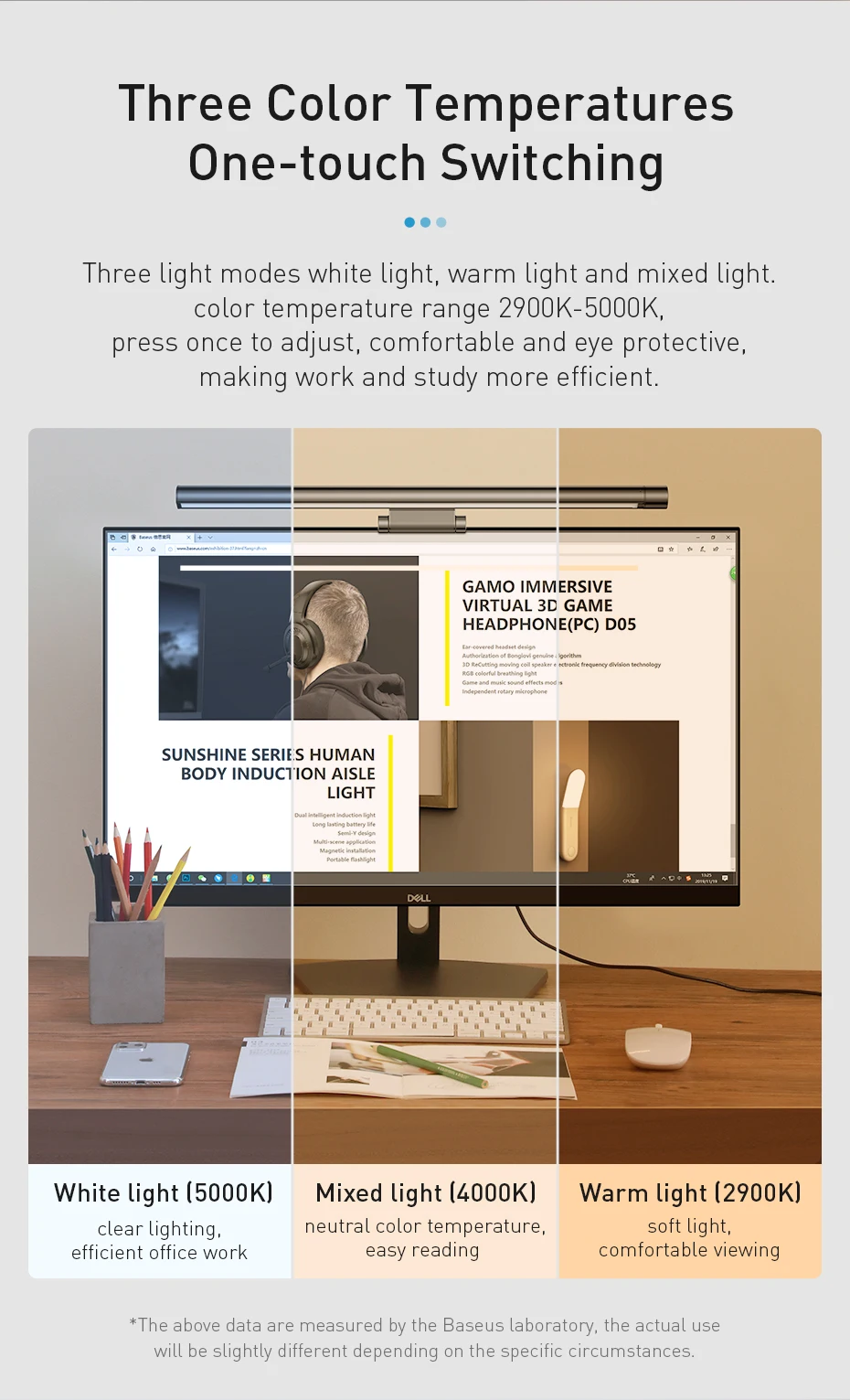 На мой взгляд - лучшая лампа из тех, что крепятся на монитор. Сравнивал с Xiaomi Miija, но Baseus понравилась больше. Управление сенсорное, два режима освещения (холодный свет и тëплый свет). Питание - по кабелю через разъëм USB type C. Из минусов - не подойдëт для толстых LED мониторов-телевизоров. Т.е. оптимальная толщина монитора для нормального крепления на нëм должна быть не более 1 см.