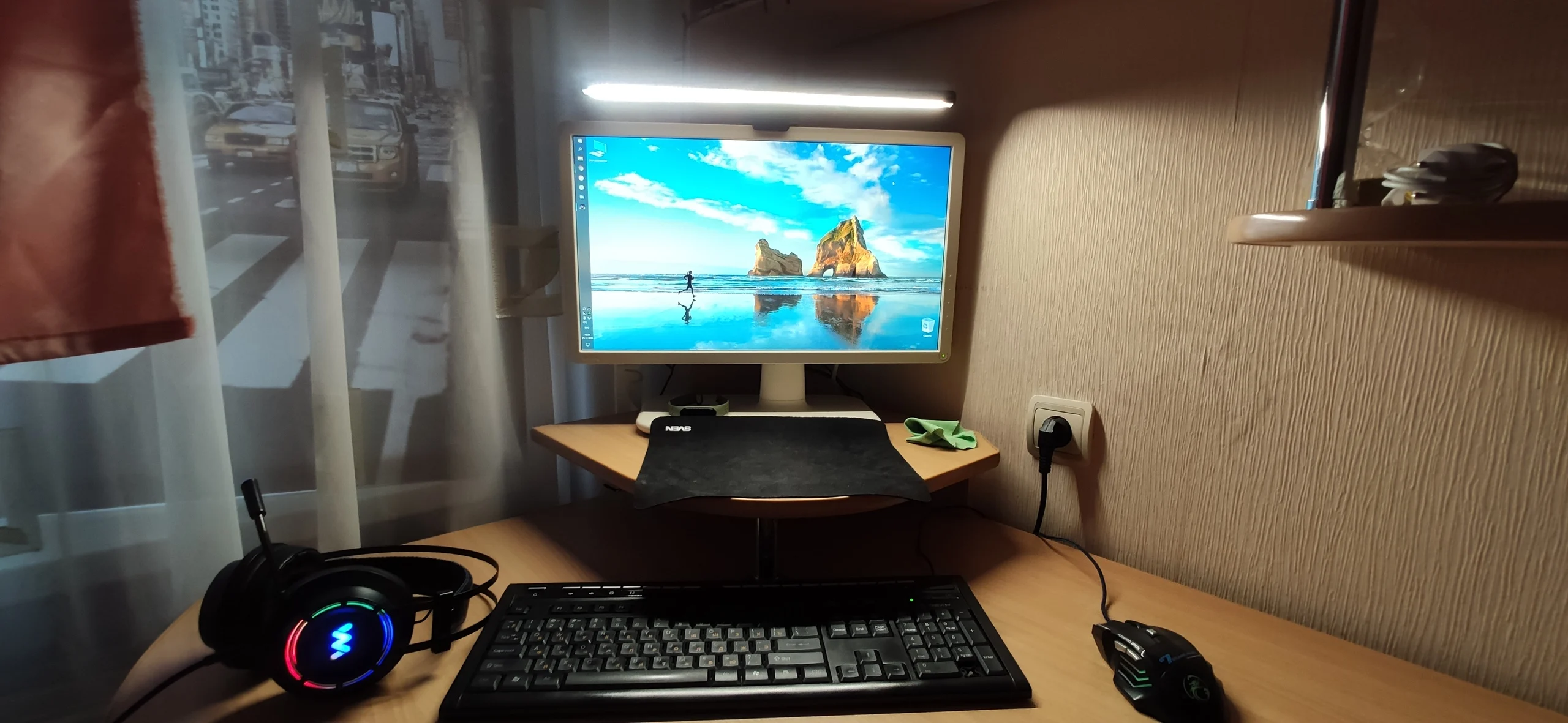 Отличная лампа!!! Прям очень советую! Доставка из Китая заняла пару недель, доставка до пятерочки, коробка пришла в целости и сохранности. Качество лампы выше всяких похвал, одна упаковка чего стоит! Удобное управление: короткое нажатие - вкл/выкл, длинное - изменение температуры свечения, крутилка - регулирует яркость, режим и яркость свечения не сбрасываются при отключении питания. Лампу запитал от USB порта монитора. Свечение ровное, без мерцания, глаза не устают. Засаетки монитора нет. Единственный минус - кнопка включения тугая, лампа съезжает при нажатии, приходится придерживать второй рукой.