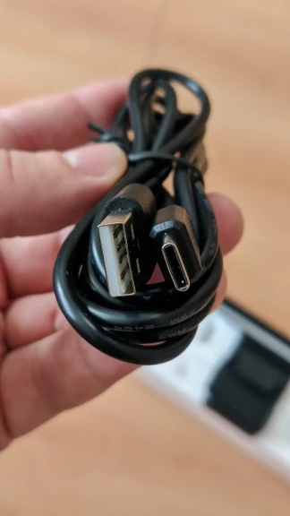 Доставили за 3 дня. Очень удобно. Кабель typeC. Питание через usb-хаб хватает. На матовом мониторе не бликует.