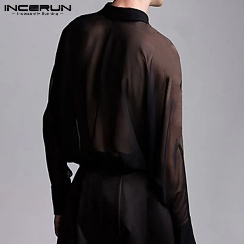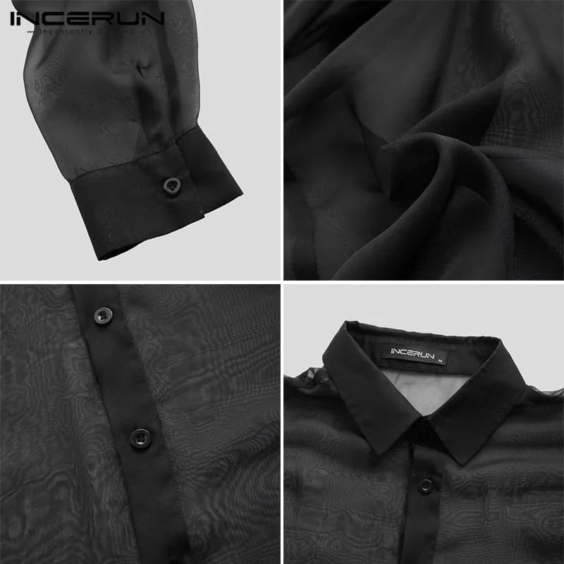 Мужская Однотонная рубашка с отворотом INCERUN, с длинным рукавом, из дышащей ткани, на тонких пуговицах, для вечевечерние, повседневная, сексуальная, уличная одежда