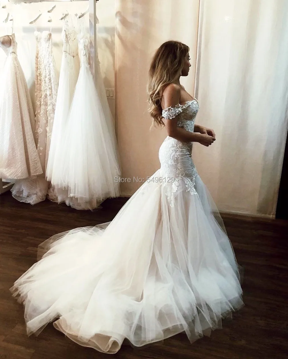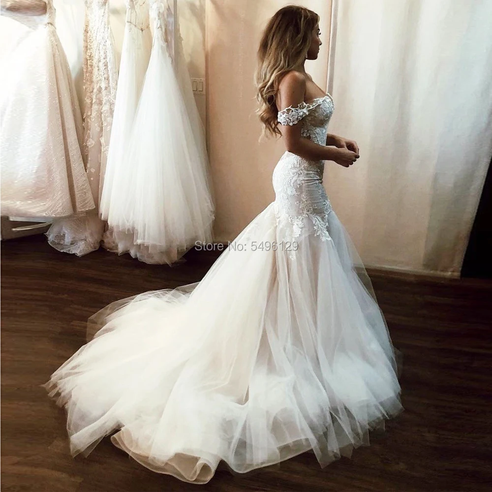 Платье невесты, кружевное, с открытыми плечами, с аппликацией