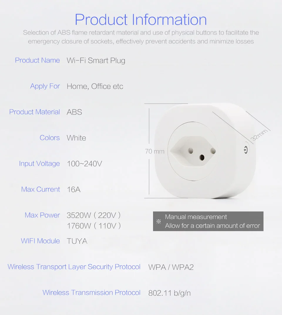 Технические характеристики: Швейцарский штекер Булавки: Качественные медные детали Отличная производительность Печатная плата: Высококачественная печатная плата хорошо спроектирована Функция: 50000 с помощью теста. Стандарт беспроводной связи: 802,11 b/g/n. Механизм безопасности: WPA-PSK/WPA2- PSK. Сервер: Amazon AWS global сервер. Материал корпуса: 750 "C V-O уровень огнезащитный Корпус ABS. Точный корпус пресс-форм. Кнопка: 750 "C V-O огнестойкий полупрозрачный силикон. Стандарт беспроводной связи: 802,11. b/g/n 2,4G Wi-Fi. Шифрование: WEP/TKIP/AES. Рабочая температура: 0 °C-40 °C(32 °F-104 °F) Рабочая влажность: 5%-90% относительной влажности, без конденсации.