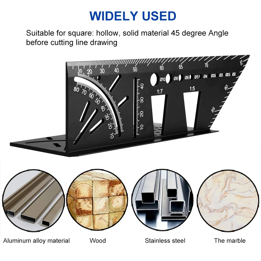 Функция Идеально подходит для трехмерной маркировки, измерения 45 и 90 градусов. Может использоваться в качестве маркировочного датчика для параллельных линий. Легко читается Четкая гравировальная Метрическая шкала, точная и легко читаемая. Сверло для определения диаметра сверла. Удобные Тонкая полировальная поверхность, удобная в руке и простая в использовании. Поможет вам повысить эффективность работы и сэкономить время на деревообрабатывающих проектах. Характеристики: Тип: измерительная линейка Материал: алюминиевый сплав