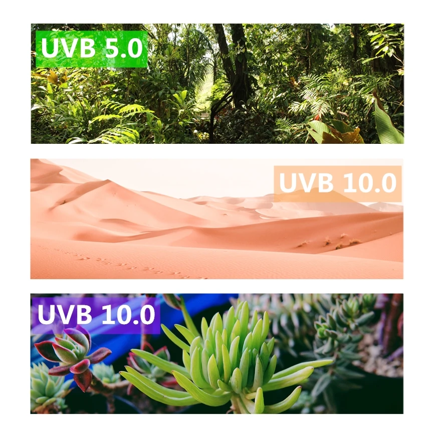UVB 5,0 имеет умеренно-высокий выход 5% UVB, аналогичный тому, что в теневой среде, такой как тропические леса и другие тропические места. Рептилии, живущие в этих местах обитания, получают меньше ультрафиолетового излучения из-за многих климатических условий и условий среды обитания, которые предотвращают попадание прямого солнечного света на них или на их зоны нагрева.