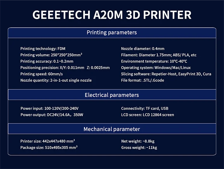 1· Printing parametersPrinting technology: FDMPrinting volume: 250*250*250mm³Printing accuracy: 0.1~0.2mmPositioning precision: X/Y: 0.011mm Z: 0.0025mmPrinting speed: 60mm/sNozzle quantity: 2-in-1-out single nozzleNozzle diameter: 0.4mmFilament: Diameter 1.75mm; ABS/ PLA, etcEnvironment temperature: 10℃-40℃Operating system: Windows/Mac/LinuxSlicing software: Repetier-Host, EasyPrint 3D, CuraFile format: .STL/.Gcode2· Electrical parametersPower input: 100-120V/200-240VPower output: DC24V/14.6A,350WConnectivity: TF card, USBLCD screen: LCD 12864 screen3· Mechanical parametersPrinter size: 442x447x480 mm3Package size: 510x495x305 mm3Net weight: ~8.8kgGross weight: ~11kg
