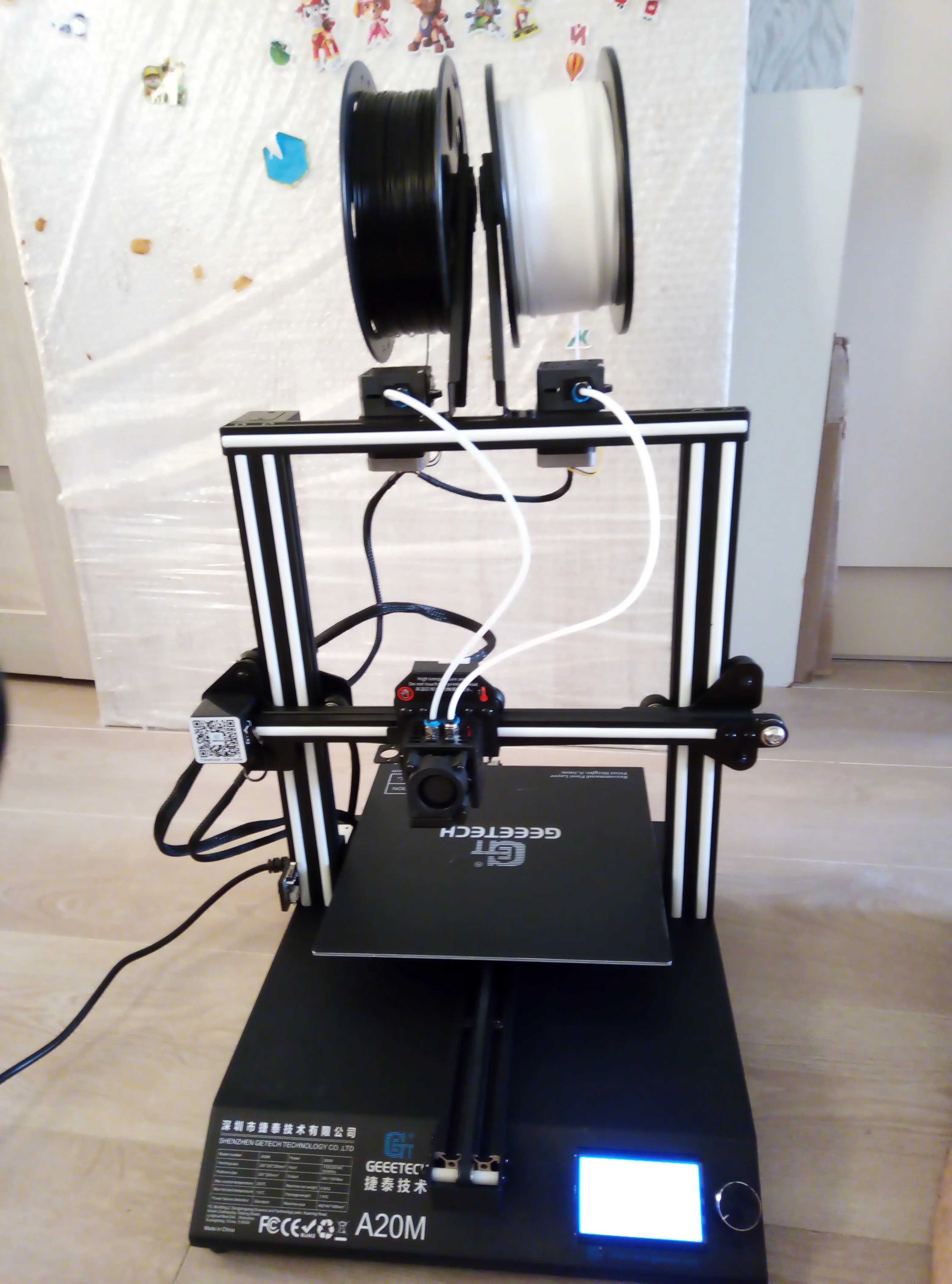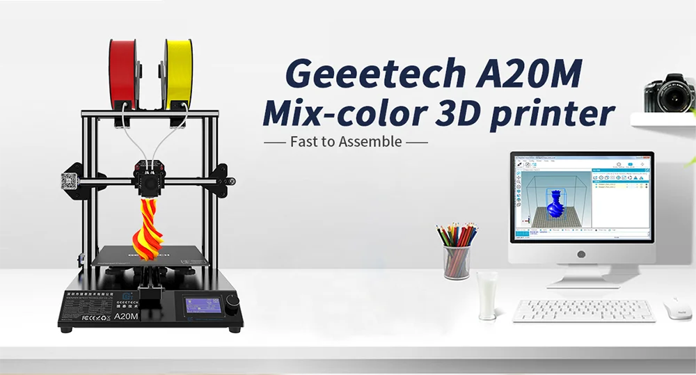 1.[GT2560 Motherboard] Geeetech A20M 3D Printer with Open Source GT2560 Control Card With 2 extruders, 2 in 1 out hot end, adjustable mixed colour printing with different colour ratios.2. Modular design, easy to assemble: The modular design makes it easy to assemble the printer in three steps. Very suitable for beginners. The classic combination of white and black adds a touch of simplicity and excellence.3. [Large printing range] With a volume of 250 x 250 x 250 mm³ and the gantry structure of the classic Prusa I3 3D printer to display the print details in 360°. The printing is done with an accuracy of 0.1 mm. This allows you to print objects with smooth surface, clear angles and strong structure.4. [Filament detector and resume function] A20M comes with filament detector and resume function. After the filament is used up, the printing process is automatically finished. If the printing process is suddenly interrupted, you can continue printing process. Save more time and energy.[Extruder cover with features 360° ventilation design] Its well-designed extruder greatly reduces the risk of clogging or leaking. Greatly enhancing the dissipation of heat and guarantees excellent printing quality.