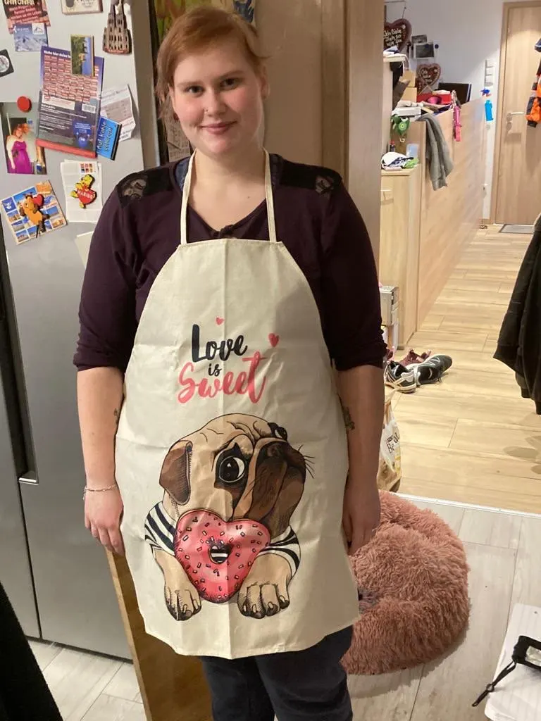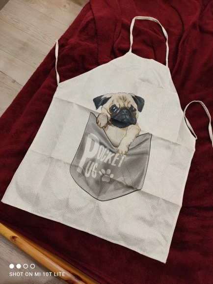 фартук маловат. для детей. простой, но милый. покупала подруге, фанатке мопсов. она его использует для работы во время творчества. для кухни мне он кажется несерьёзным - слишком маленький.