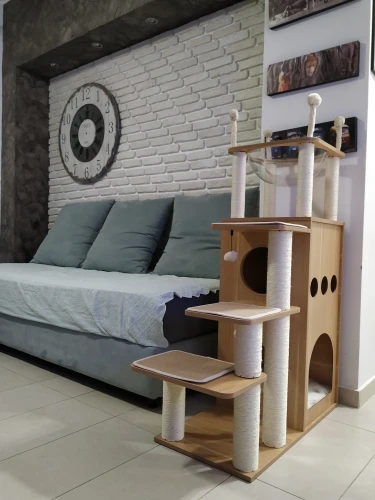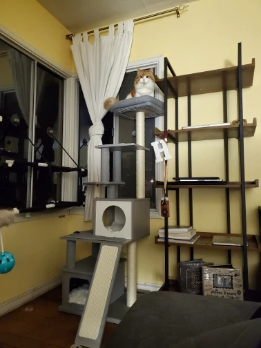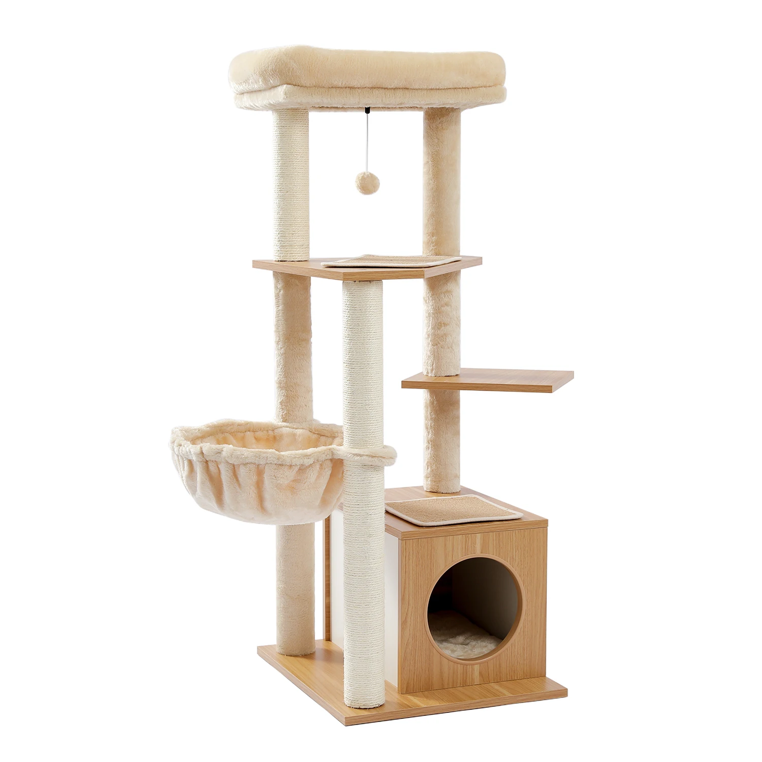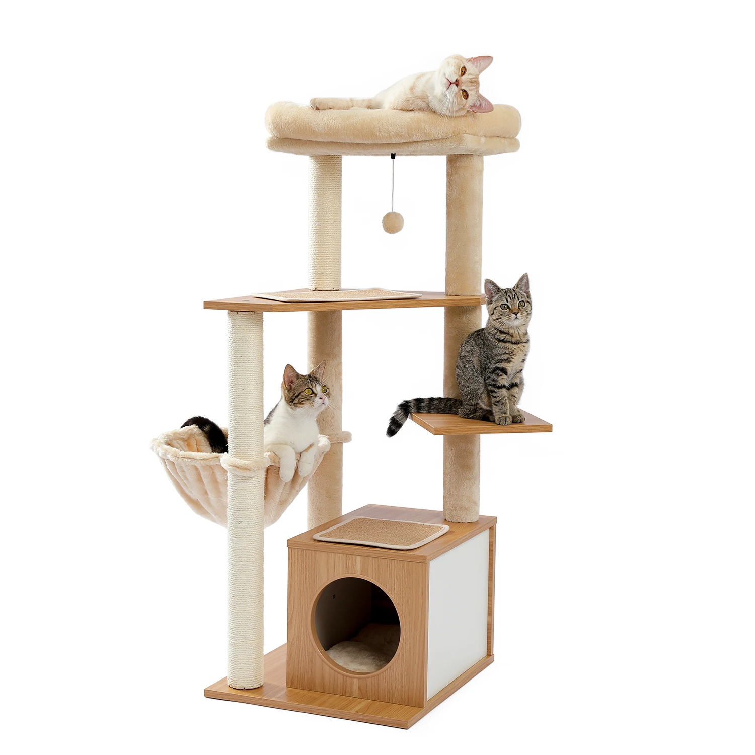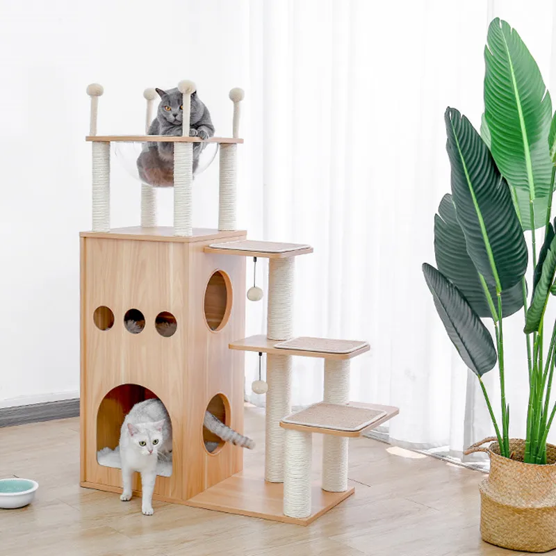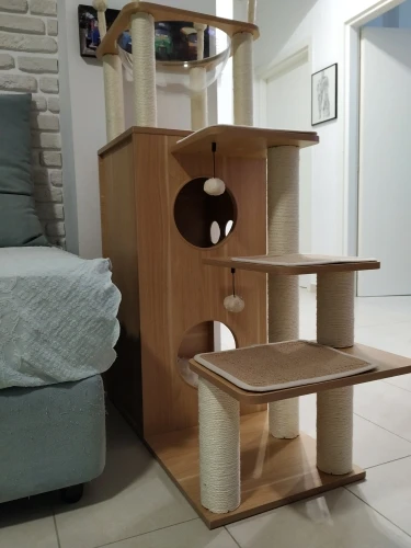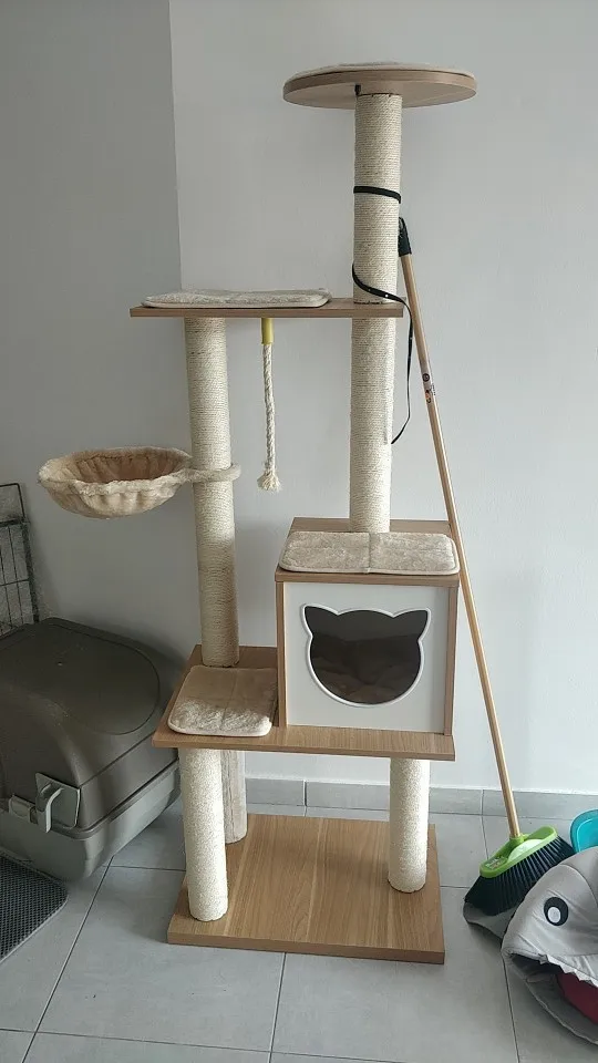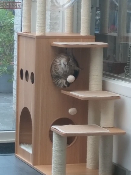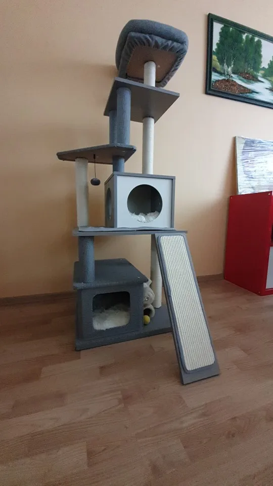 Универсальный комплекс отдыха и развлечений: несколько слоев предназначены для кошек, чтобы прыгать вверх и вниз, чтобы получить много упражнений. Кошки могут сразиться с висячим мячом, чтобы развлечь себя и приручить свои охотничьи навыки. По пути они прыгают вокруг кошачьего дерева, столбы, покрытые натуральным сизалем, позволяют им затачивать коготь. После того, как ваш энергичный котенок устанет, он может прокрасться в конюшню, чтобы поспать или вздремнуть на вершине окуня.
