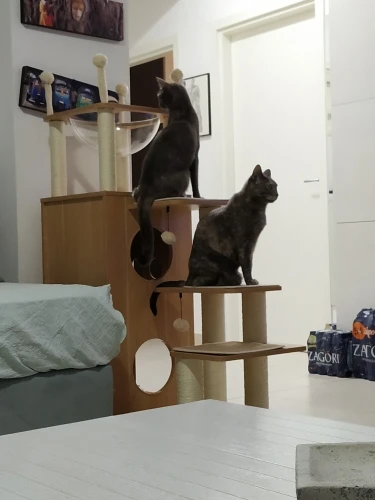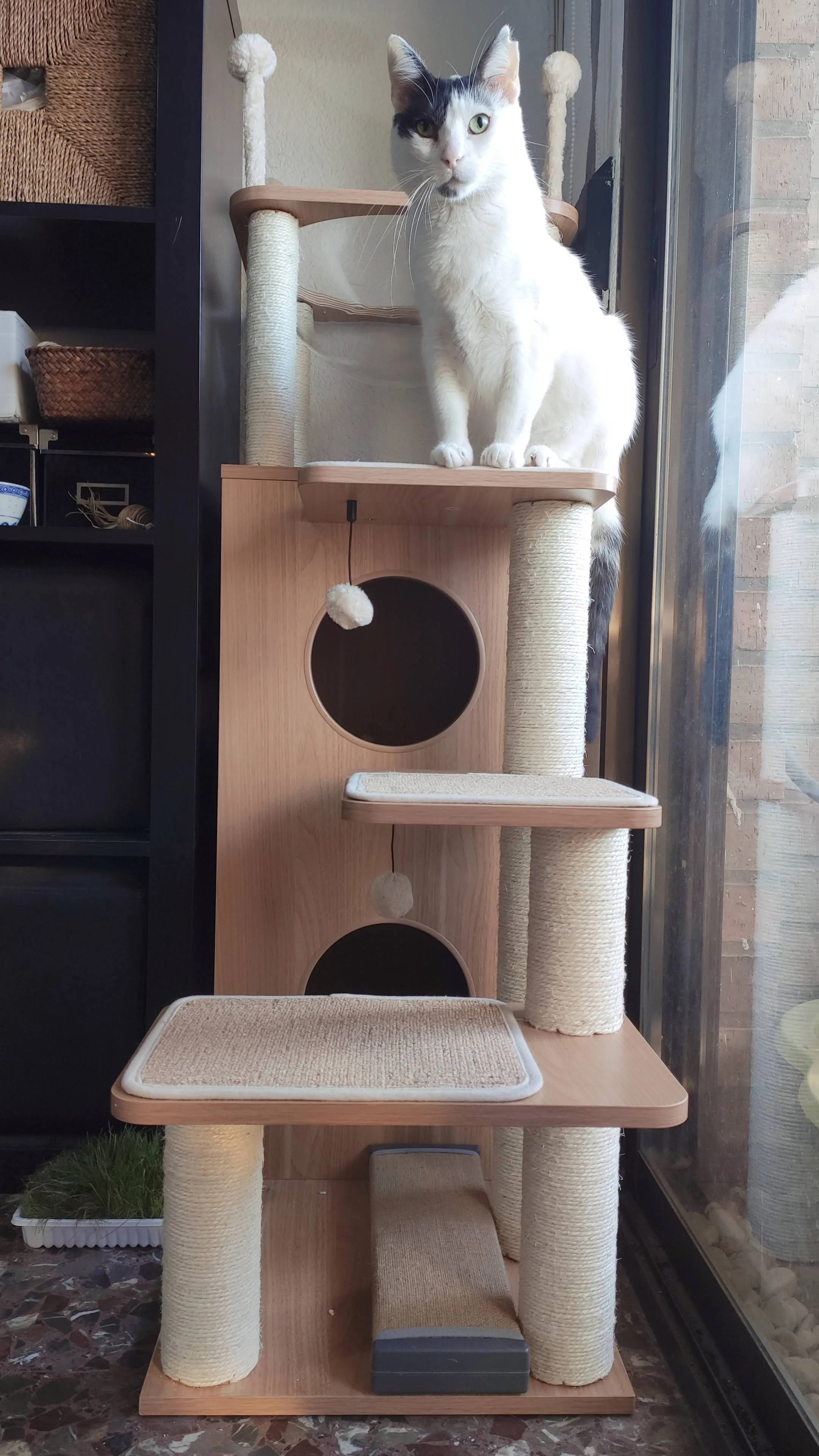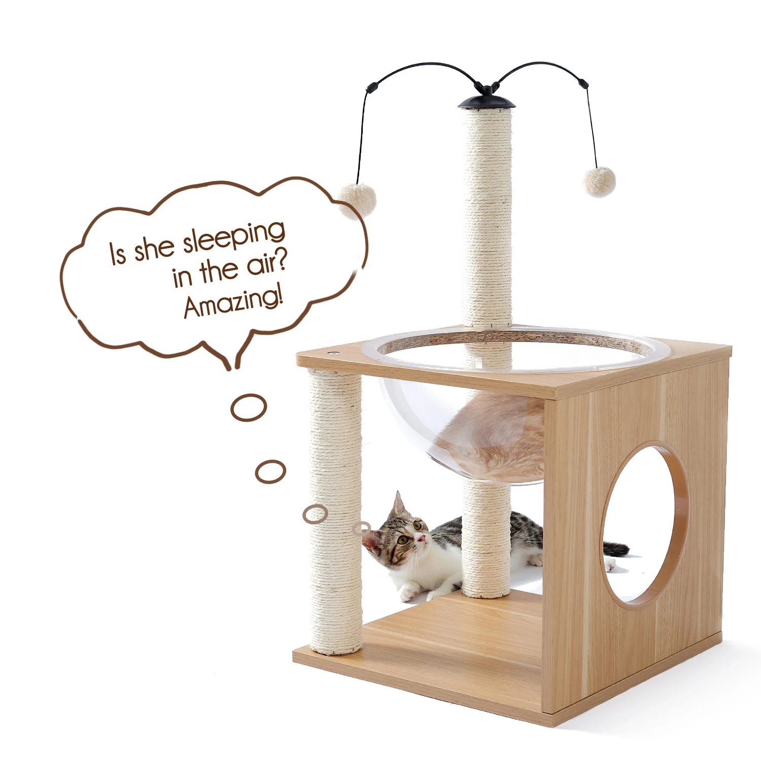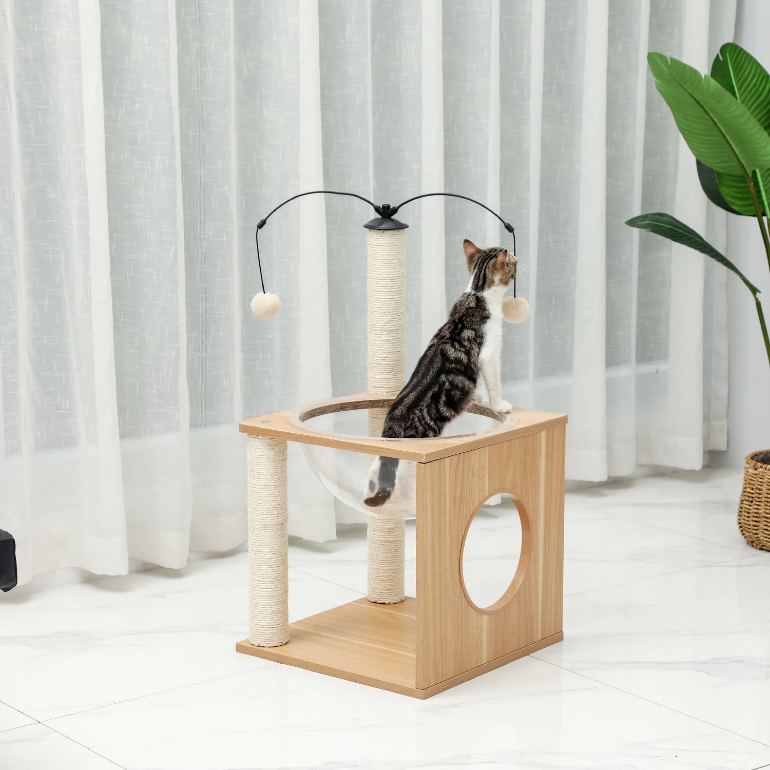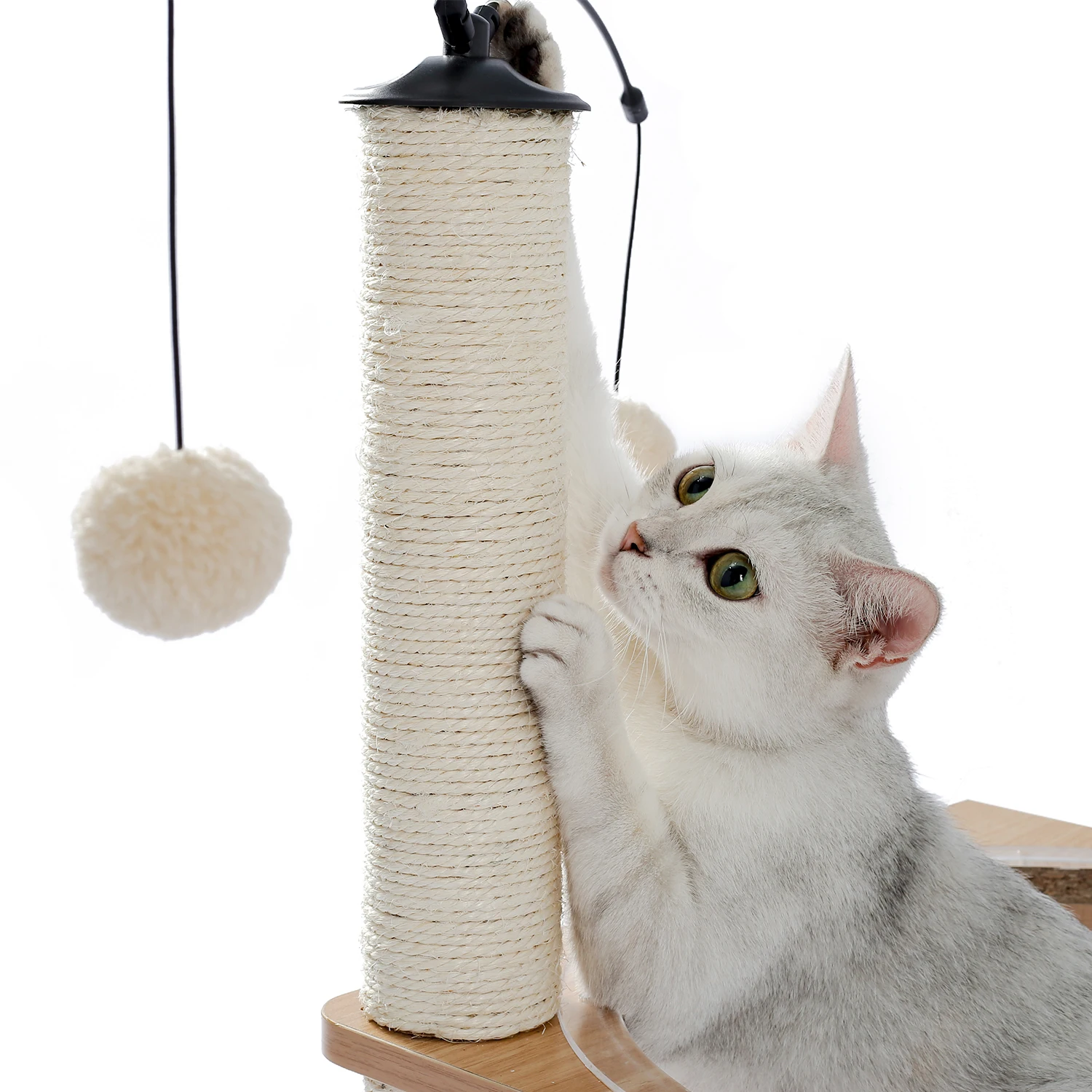 Универсальный комплекс отдыха и развлечений: несколько слоев предназначены для кошек, чтобы прыгать вверх и вниз, чтобы получить много упражнений. Кошки могут сразиться с висячим мячом, чтобы развлечь себя и приручить свои охотничьи навыки. По пути они прыгают вокруг кошачьего дерева, столбы, покрытые натуральным сизалем, позволяют им затачивать коготь. После того, как ваш энергичный котенок устанет, он может прокрасться в конюшню, чтобы поспать или вздремнуть на вершине окуня.