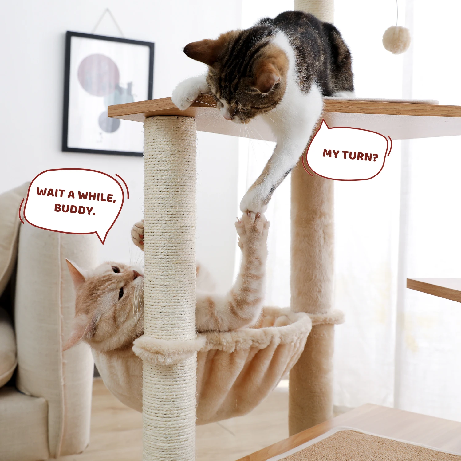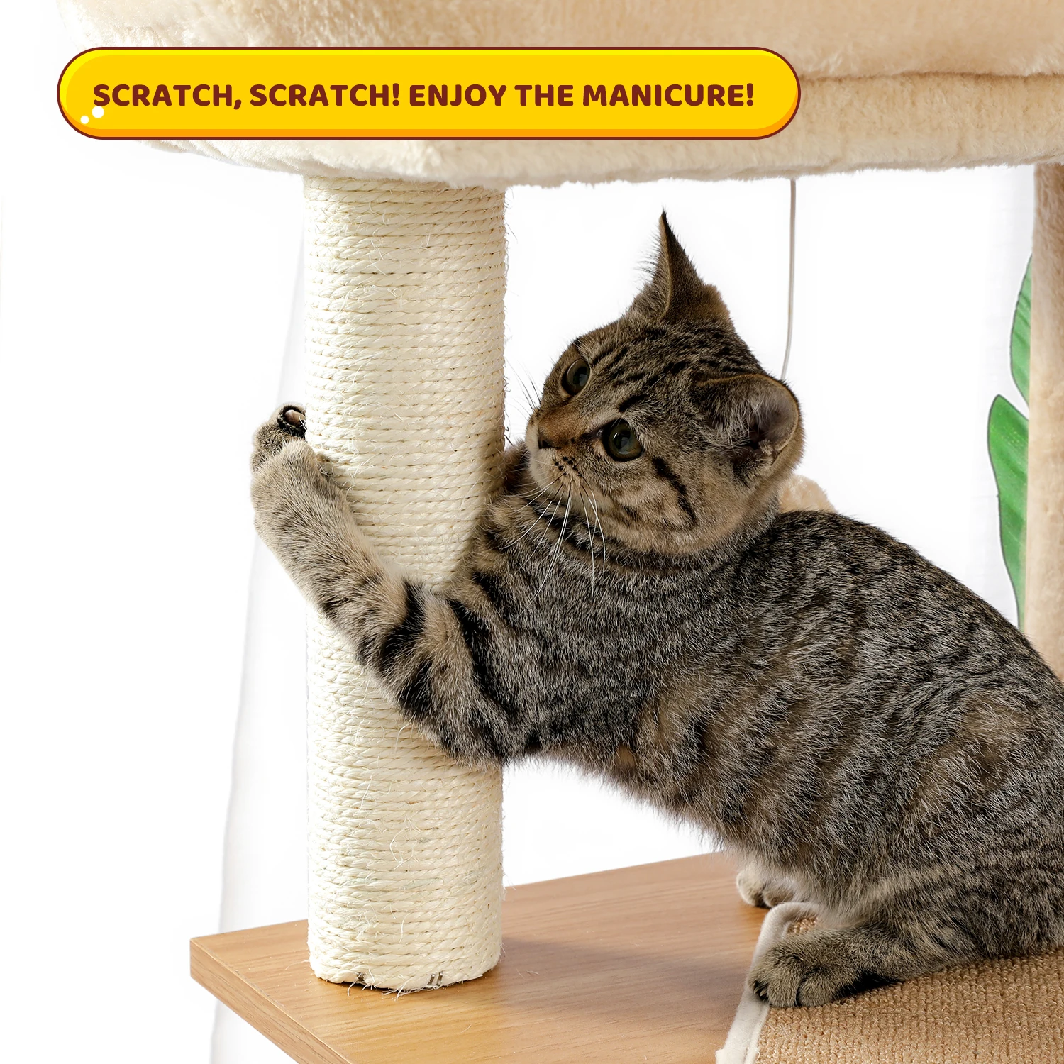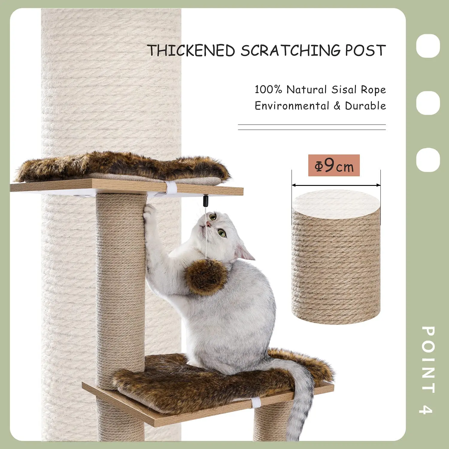 ·Полностью покрытая сизалем Когтеточка: деревянные когтеточки для кошек полностью обернуты 100% натуральная сизалевая веревка, прочная и более устойчивая к царапинам, по сравнению со скрытой тканью скребок на рынке. Сверхмощная кошачья башня с деревянным материалом придает дополнительную стабильность и долговечное качество.
