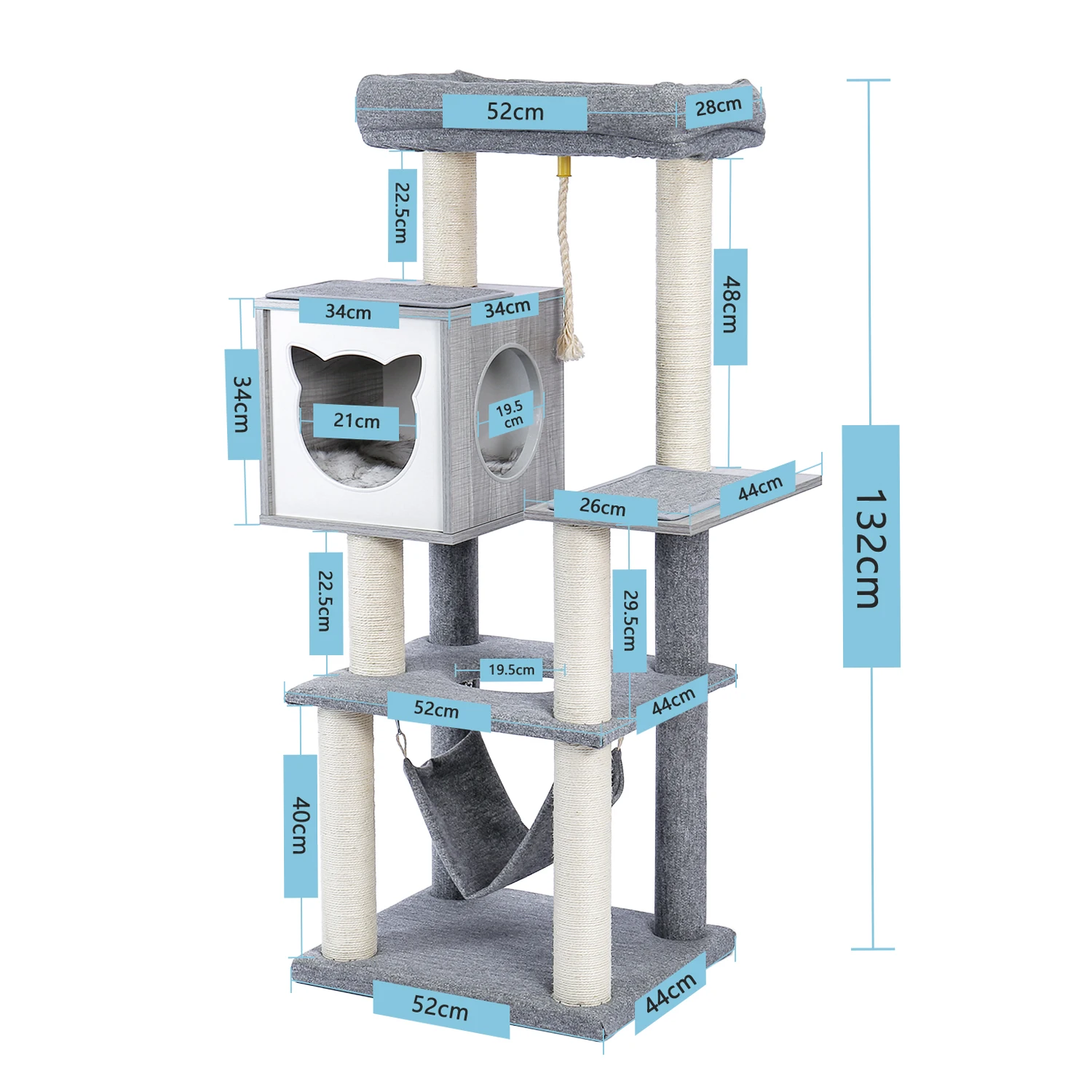 Надежная стабильность и прочность: изготовлено из карбоновой доски для дополнительной прочности, все столбы покрыты натуральная сизалевая веревка, которая лучше укрепляет прочность, И 17,2 ”* 18,8” доска с большим контуром на его базе, ваш fury друг может прыгать внутрь и из кошачьего дерева безопасно, не беспокоясь о опрокидывании.