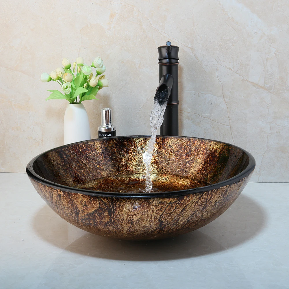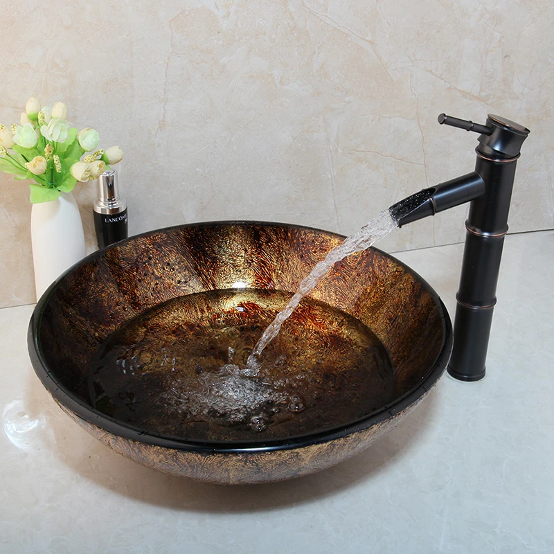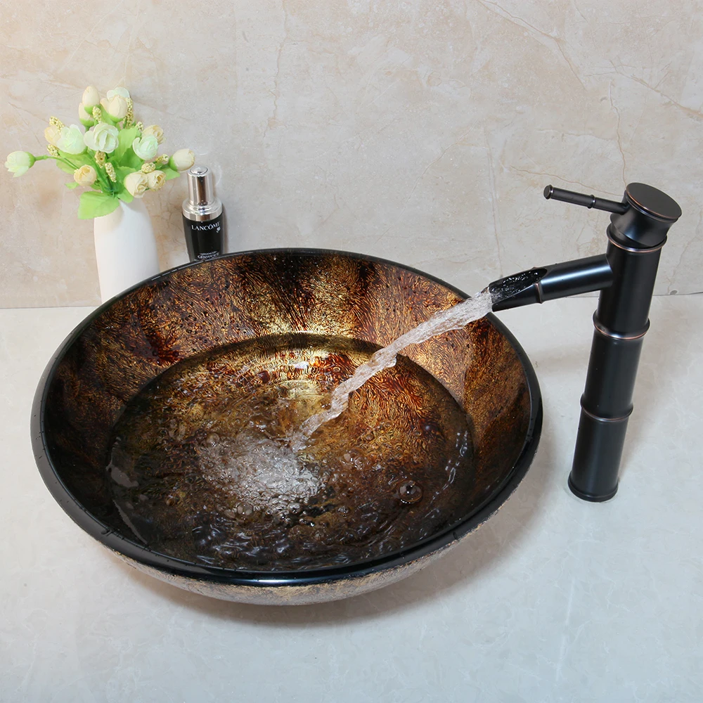 OUBONI коричневый круглый смеситель для раковины и раковины из закаленного стекла ручная роспись смеситель из латуни для ванной комнаты