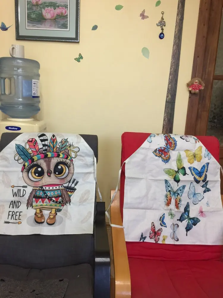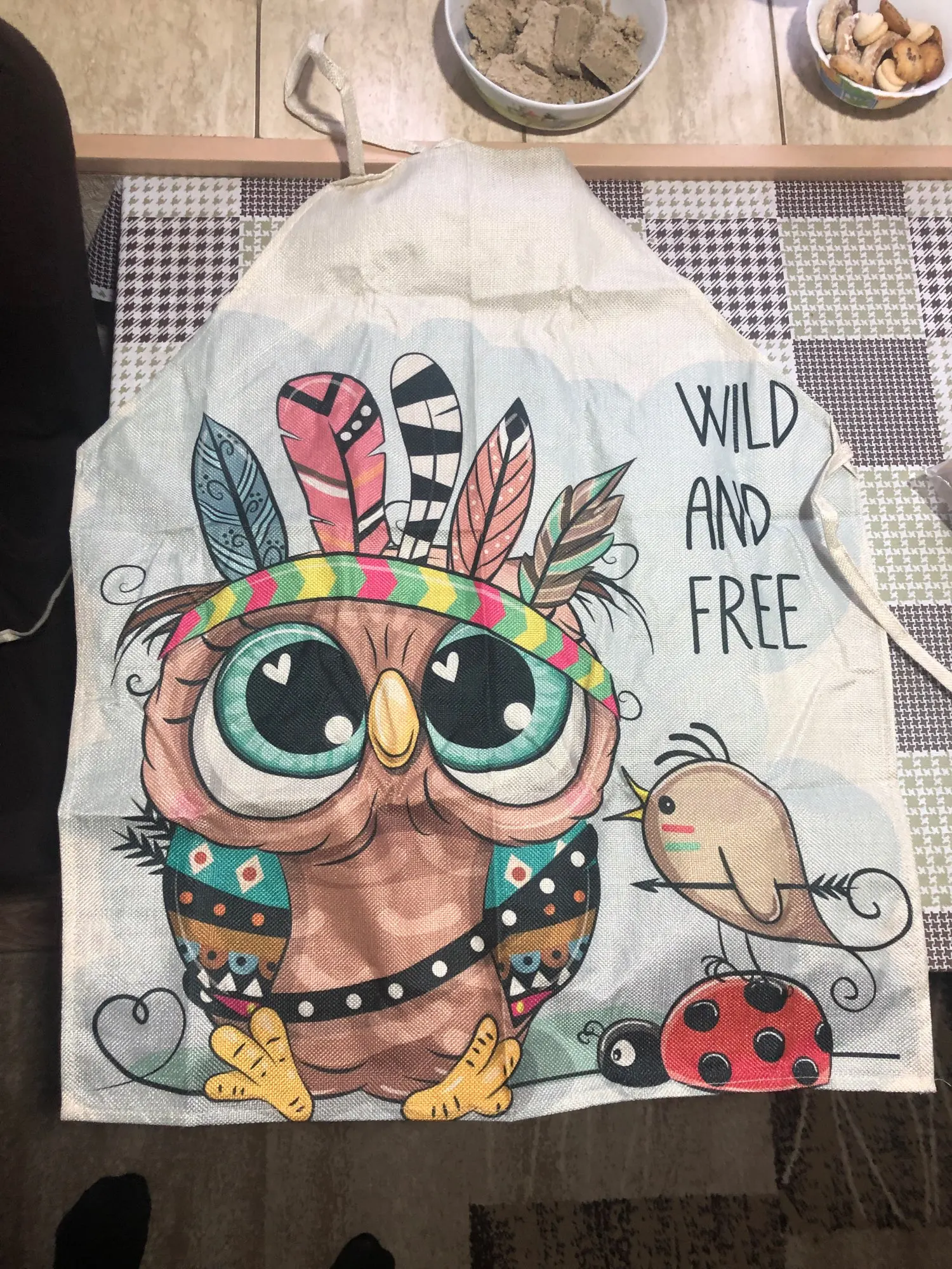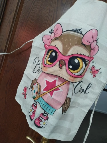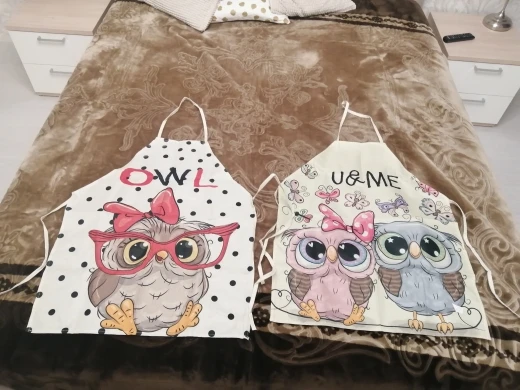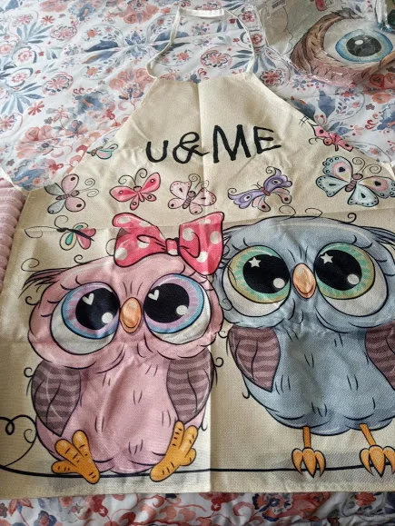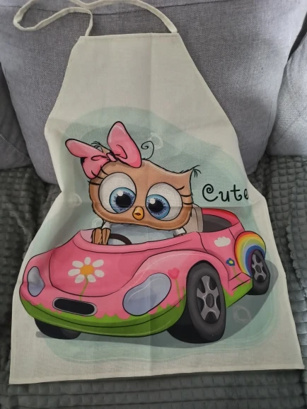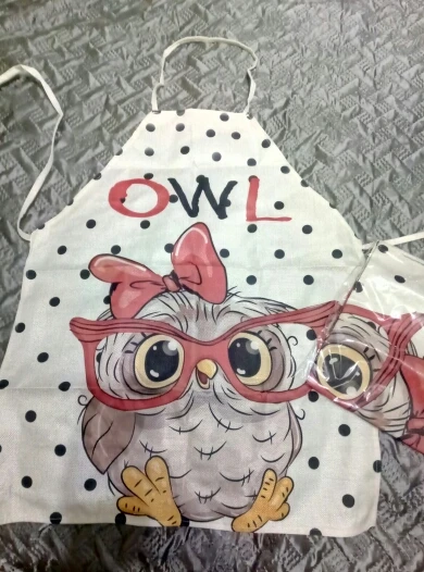 Вместо совы на машинке прислали бабочек, открыла спор , деньги вернули. Сам фартук на взрослого человека, состав ткани плотный лён ( или чём-то пропитан), думаю после стирки будет мягче, рисунок напечатан ( а не резиновая наклейка) это явный + .