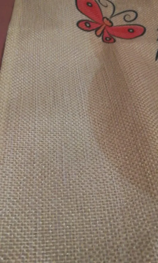 Среднее качество, жесткая ткань (приемлемое качество мешковины). Но хорошее качество печати.