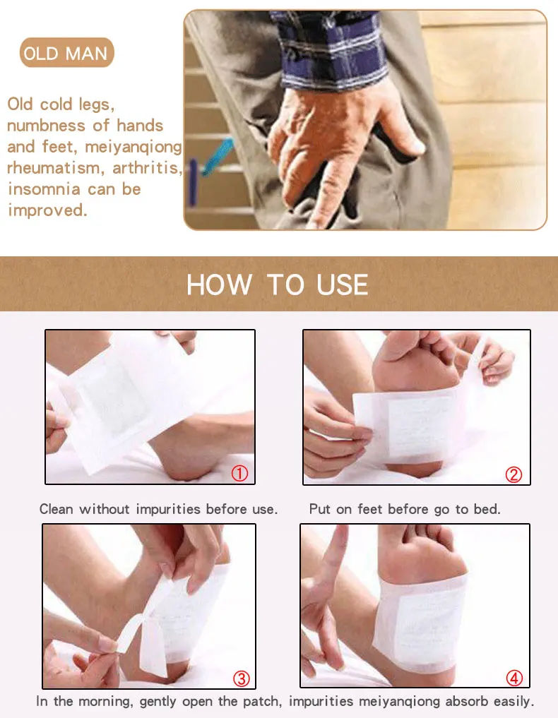 Патчи приходят в фирменной коробочке, которая была запаяна в слюду, срок годности на упаковке до 23 года, вся необходимая информация на английском языке есть.В комплект входит 10 патчей для ног на 5 применений. В индивидуальной полиэтиленовой упаковке находится 2 патча для каждой ножки, плюс 10 пластырей для их фиксации на ноге. Мне давно интересны различные средства из нетрадиционной медицины, поэтому я с удовольствием экспериментирую)Ингредиенты(с коробочки): бамбуковый уксус, порошок конхиолина, экстракт платикодона, экстракт крупноцветковой узколистной лаванды, экстракт горца многоцветкового, экстракт листьев полыни обыкновенной, турмалин, аскорбиновая кислота, минеральные соли. Как видите, состав отличный. Патчи призваны бороться с нарушением сна, усталостью ног, проблемами ЖКТ, запорами, тучностью, выводить токсины из организма.