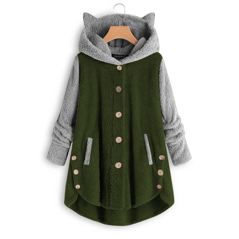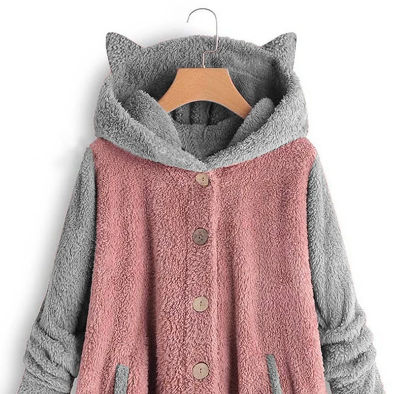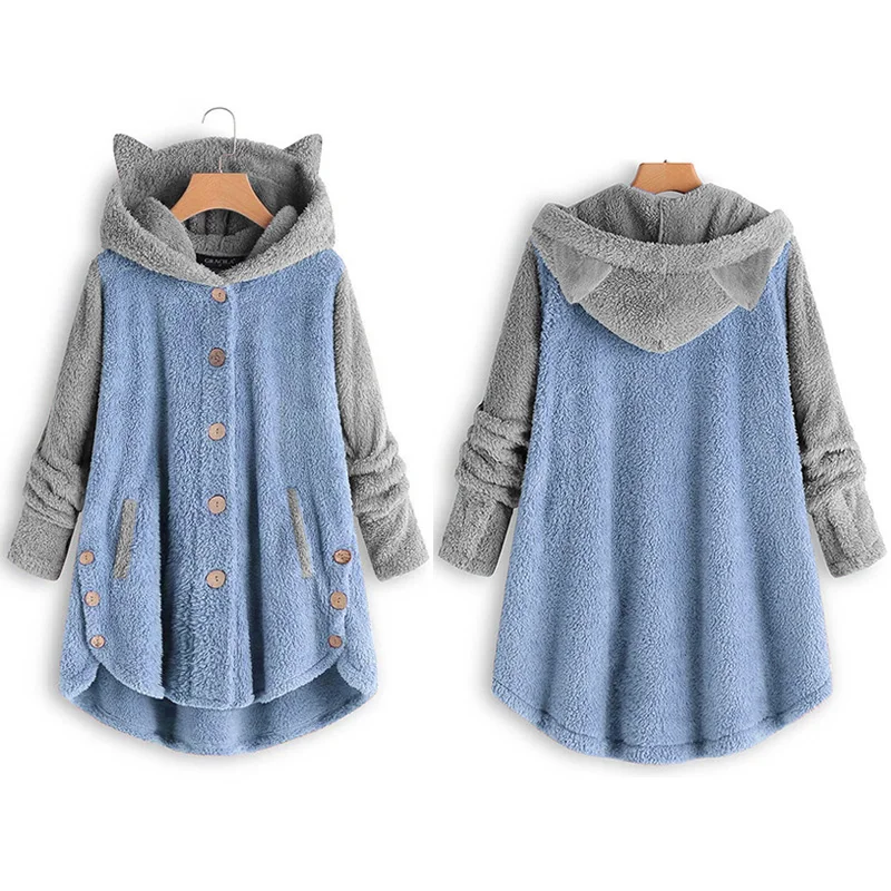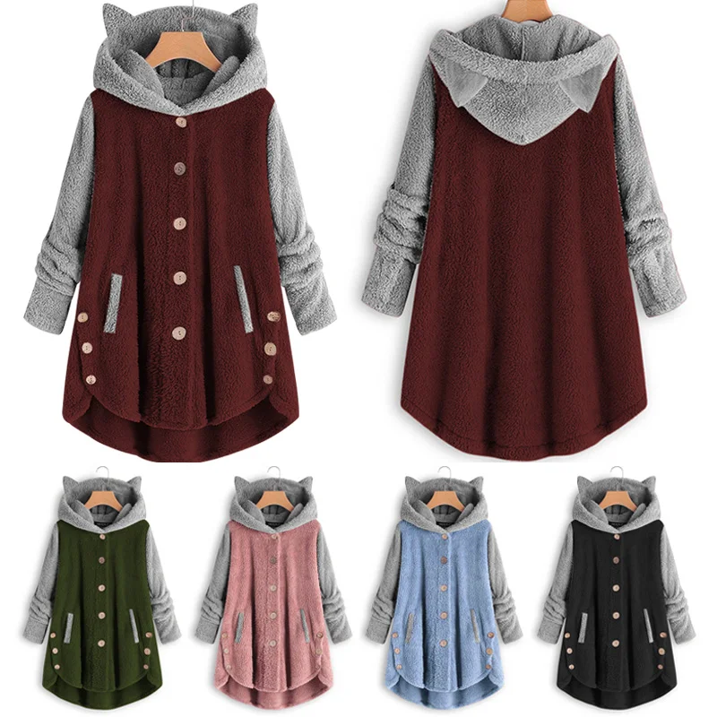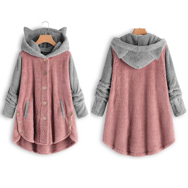 Куртка флисовая женская, с кошачьими ушками и капюшоном, теплая, длинная, свободная, с карманами, Осень-зима 2021