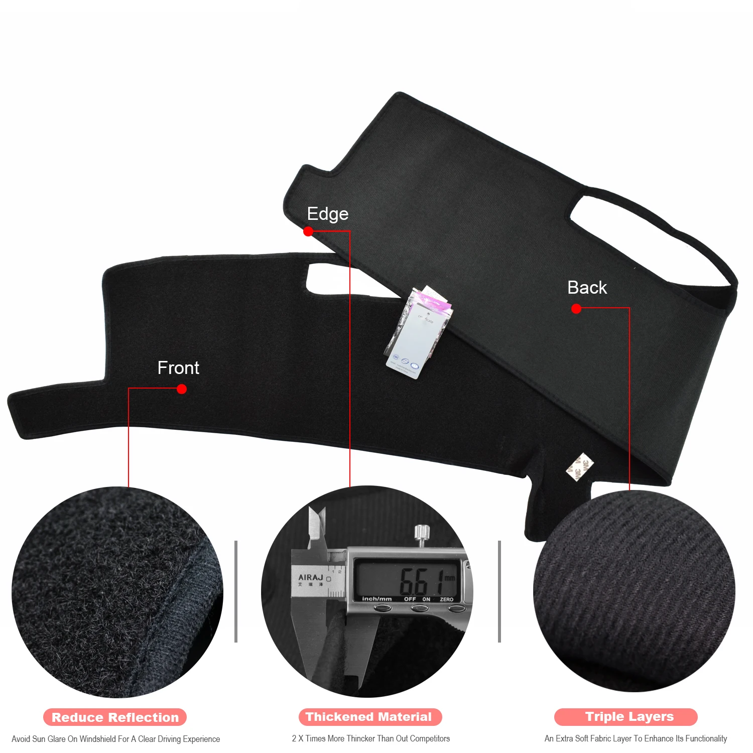 Простая установкаКонтуры для приборной панелиНе садится, не выцветает или не искажаетЗащищает приборную панель от ультрафиолетовых лучейУстраняет растрескиваниеУменьшает бликиУФ стабилизированная Высококачественная полиэфирная Автоматическая тканьДышит, чтобы рассеивать теплоБольшие вентиляционные вырезы, чтобы не ограничивать воздушный поток тумана