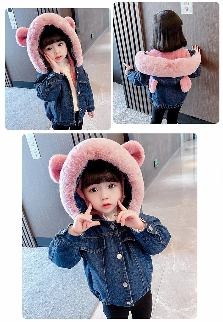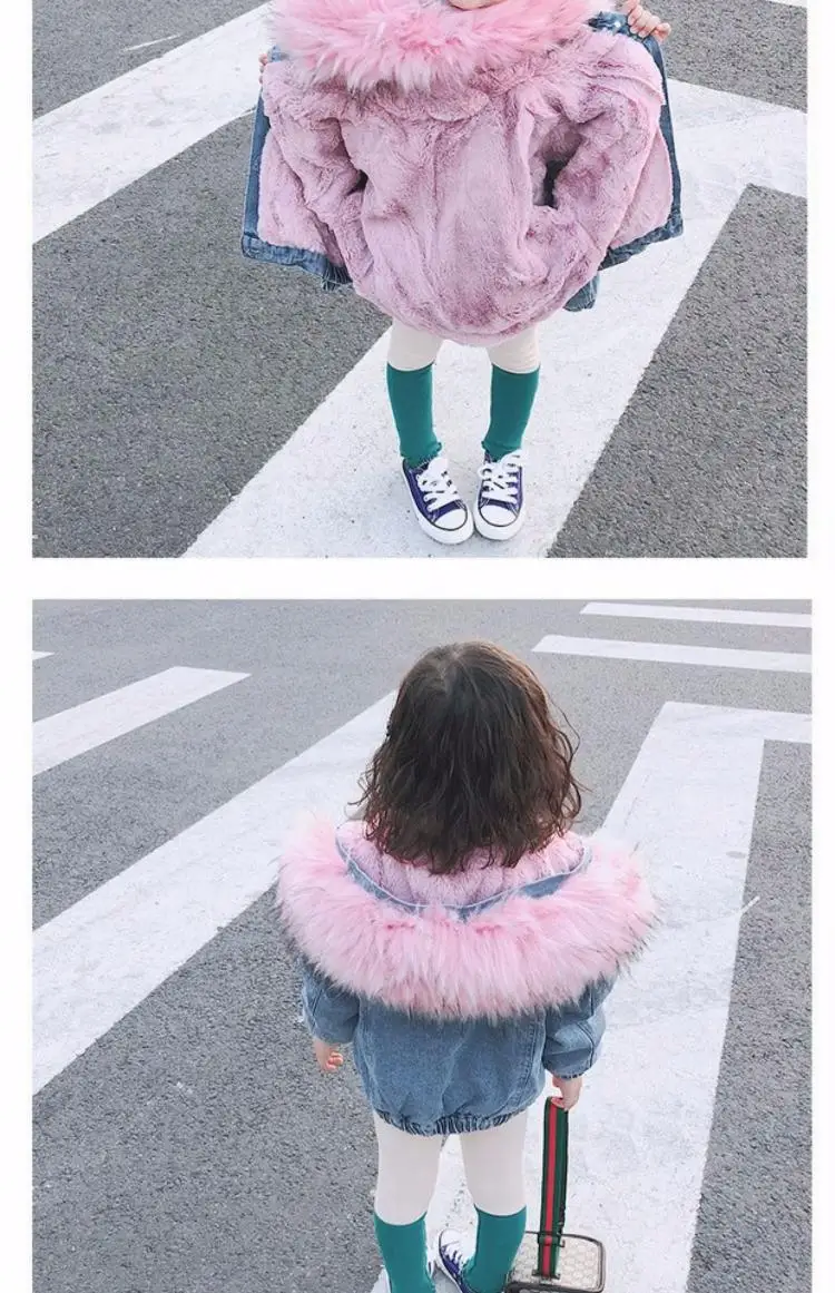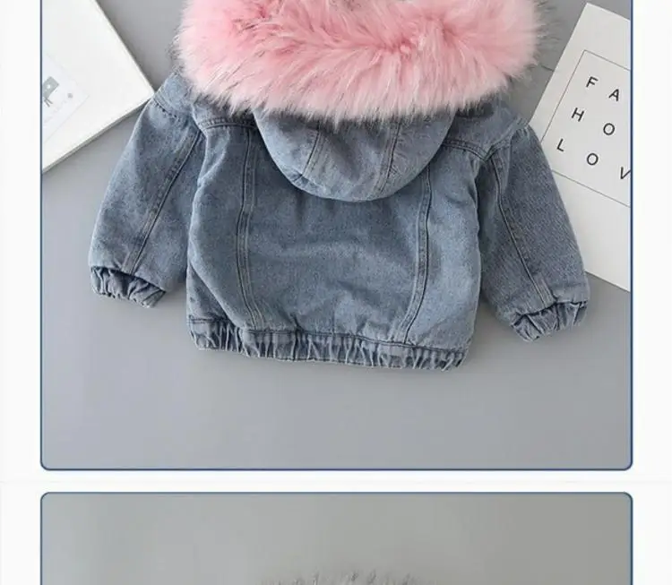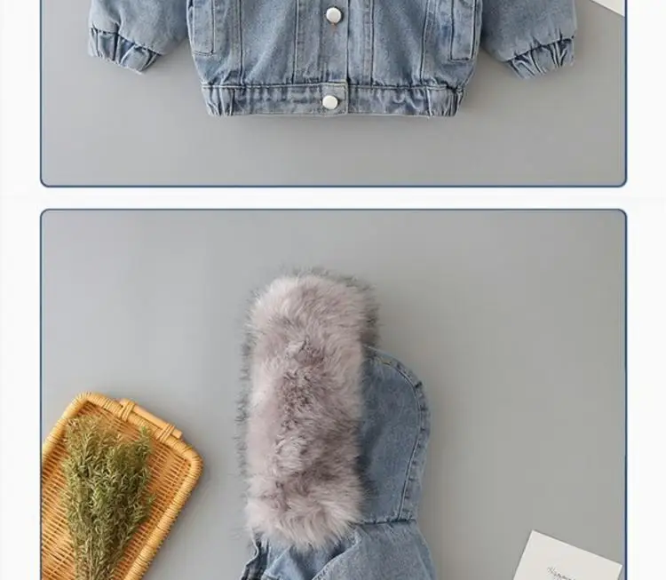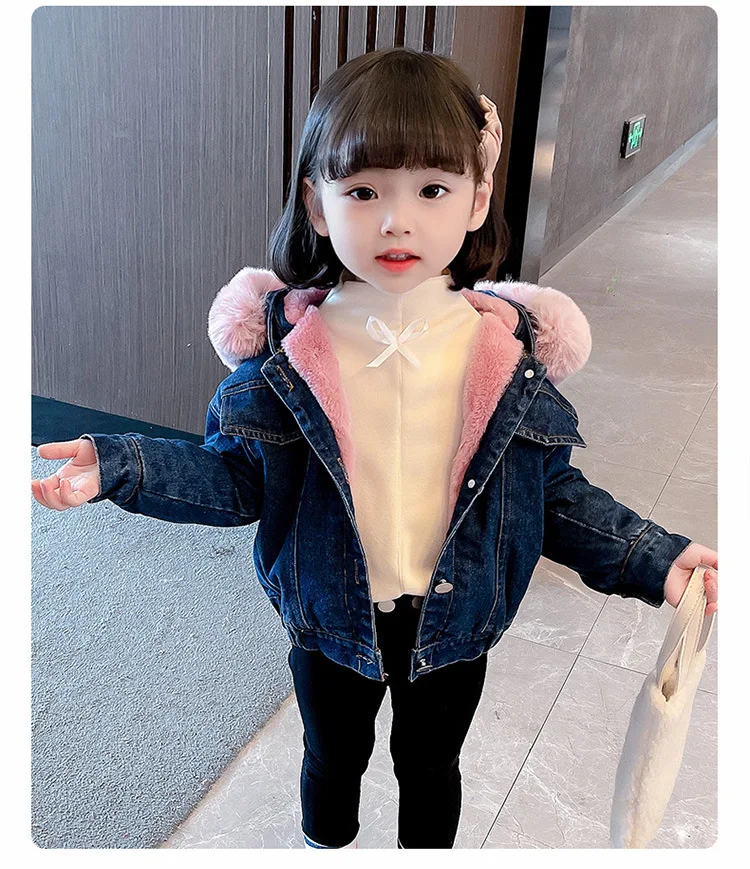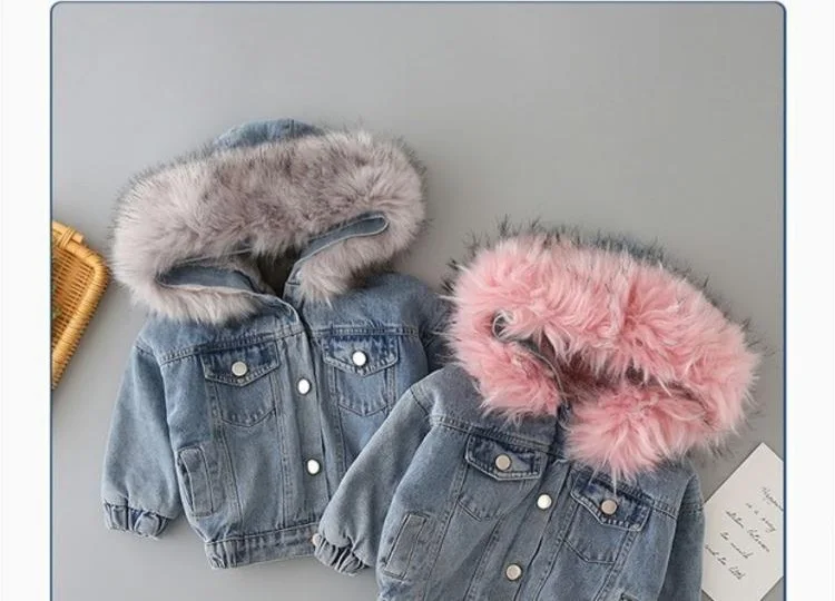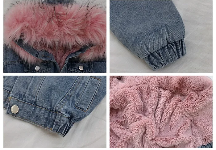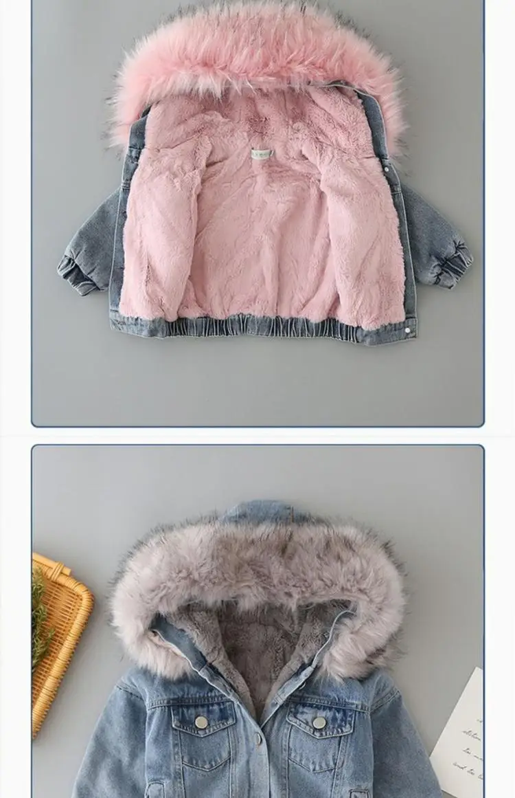 Зимняя джинсовая куртка для маленьких девочек с мехом, теплая верхняя одежда для маленьких девочек, плюшевая джинсовая куртка, хлопчатобумажная детская парка для младенцев