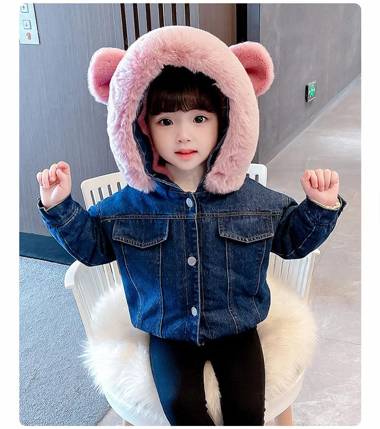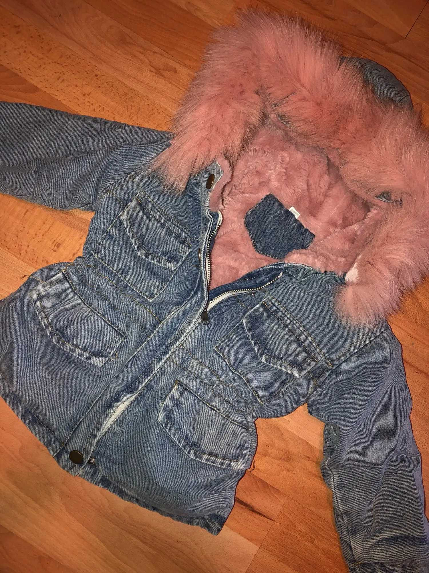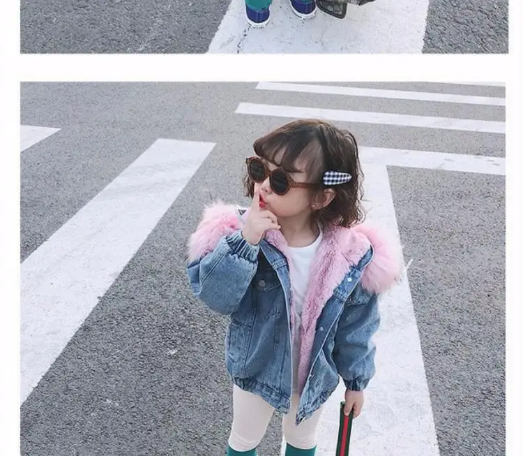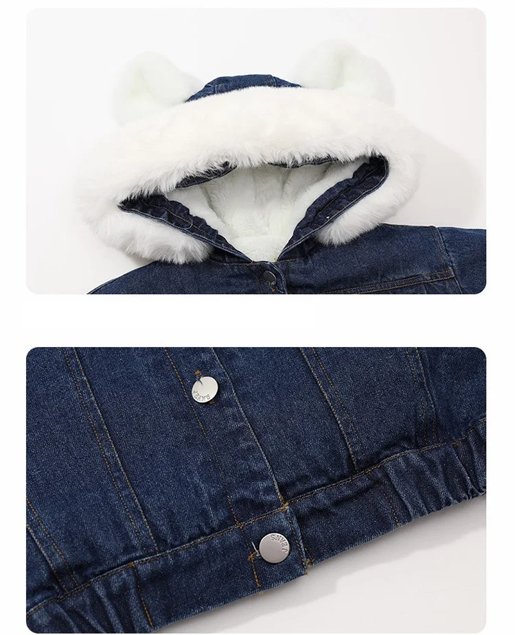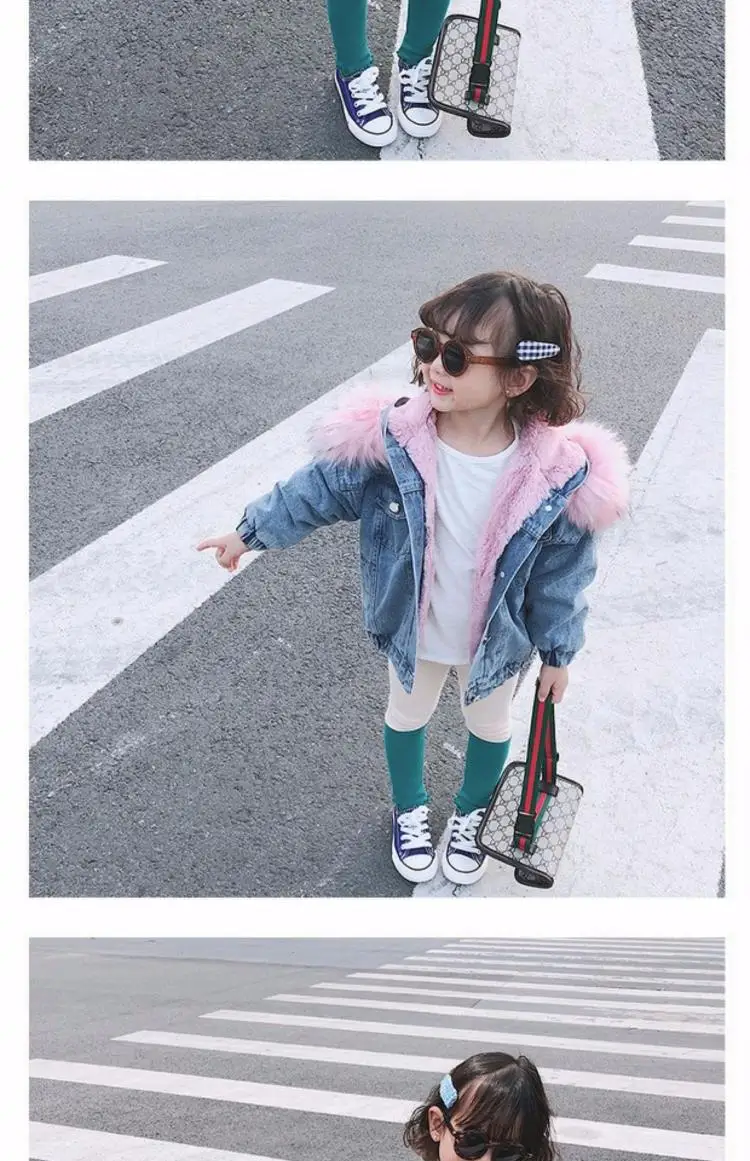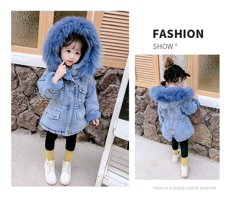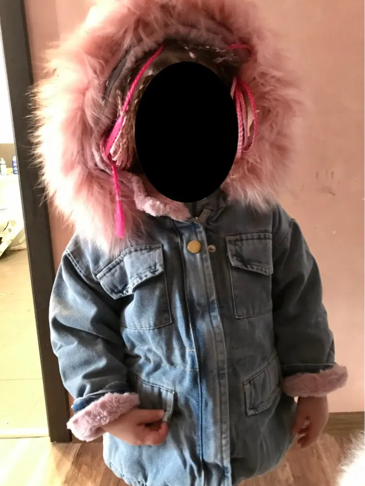 Зимняя джинсовая куртка для маленьких девочек с мехом, теплая верхняя одежда для маленьких девочек, плюшевая джинсовая куртка, хлопчатобумажная детская парка для младенцев