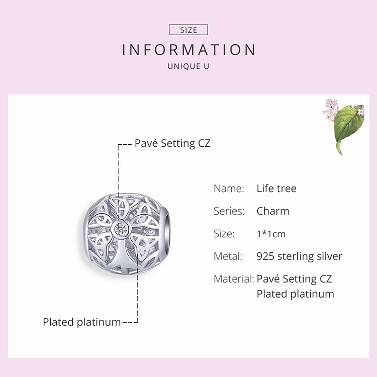 Материал: S925 + покрытая платиной + паве установка CZ Размеры: 1*1 см Описание: Тотем бесконечного слияния элементов Древа Жизни и сочетаемый с изысканной полой изобретательностью означает любовь и пожелания дружбы и семьи.