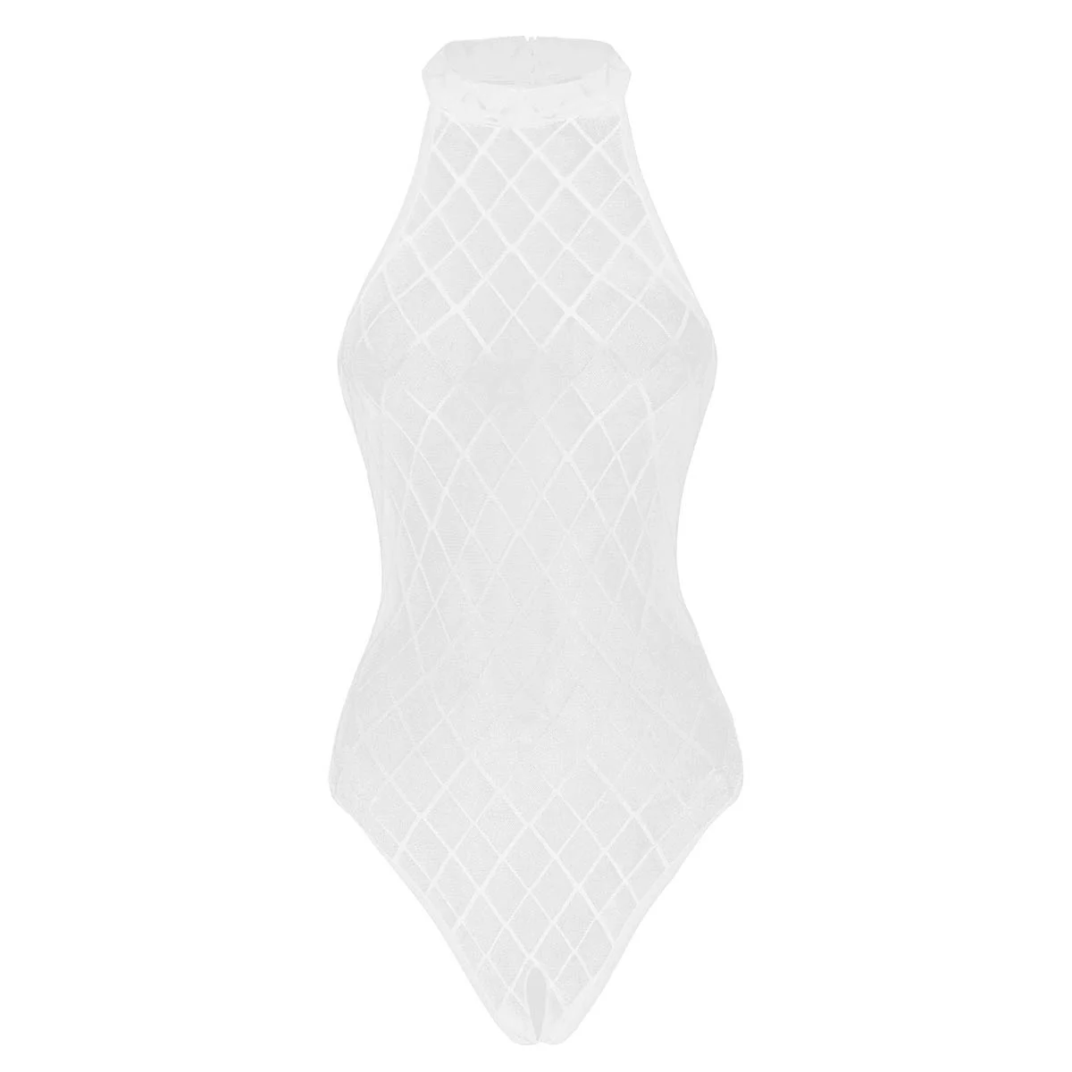 Женский нижнее белье купальник без рукавов с ложным воротником, прозрачный сетчатый купальник с открытой промежностью