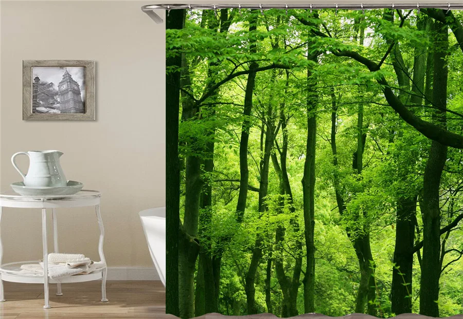 Современная занавеска для душа с 3D-принтом леса, занавеска для ванны с зеленым растением, деревом, ландшафтом, с крючками, водонепроницаемый Пейзаж для ванной комнаты