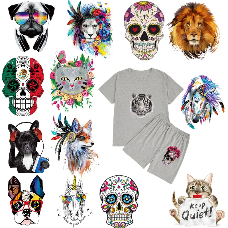 Термонаклейка с изображением животных из мультфильмов, наклеивающиеся с помощью утюга сахарные черепа, кошки, собаки, лошади, цветов, нашивки для детей, одежды для девочек, футболок, сделай сам, термопресс
