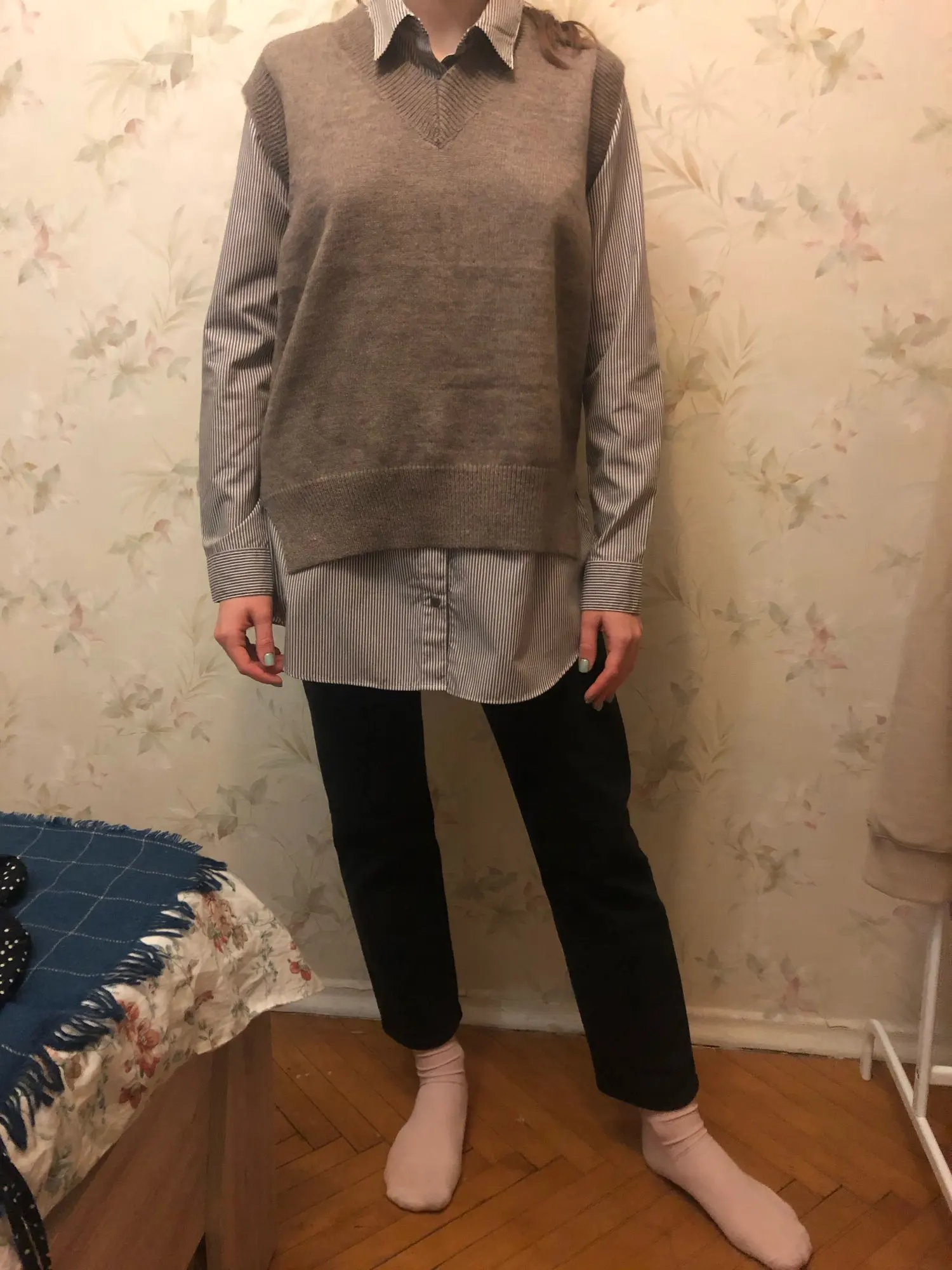Очень приятная ткань у жилетки, такая мягкая. Подойдет до 48 размера максимум, чтобы сохранялся оверсайз. Качество как в массмаркетах, а стоит в 1,5-2 раза дешевле.