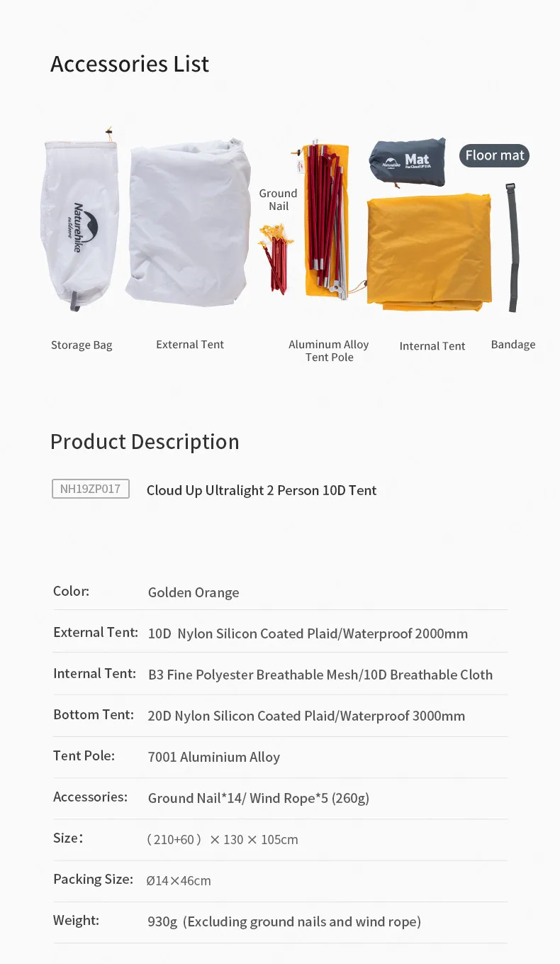 Торговая марка: NaturehikeНазвание: облачный Сверхлегкий 2 человека 10D палаткаМодель NO. : NH19ZP017Номер детали: 2Вес: 930 г (за исключением грунтовых гвоздей и ветровой веревки)Размер: (210 + 60)* 130*105 смРазмер упаковки: φ 14*46 смАксессуары: молотый гвоздь * 14/ветровая веревка * 5(260 г)Цвет: Золотой апельсинМатериалы Описание:Внешняя палатка: 10D нейлон с силиконовым покрытием плед/водонепроницаемый 2000 ммВнутренняя палатка: B3 тонкая дышащая сетка из полиэстера/10D дышащая тканьНижняя палатка: 20D нейлон с силиконовым покрытием плед/водонепроницаемый 3000 ммСтолб палатки: 7001 алюминиевый сплав