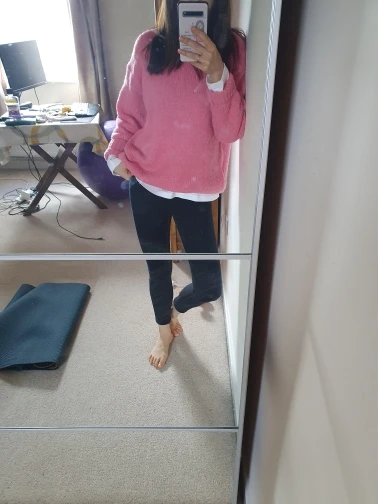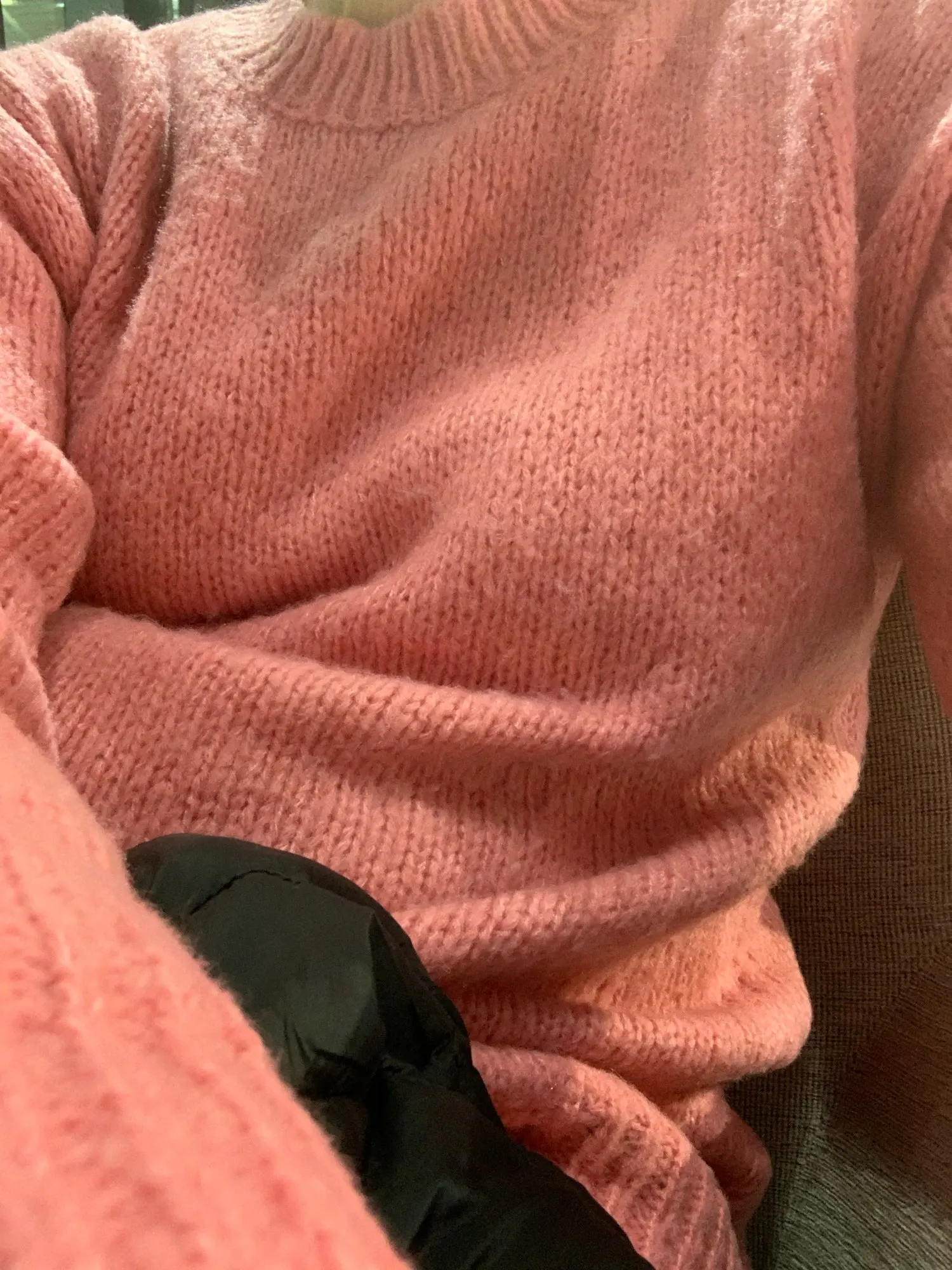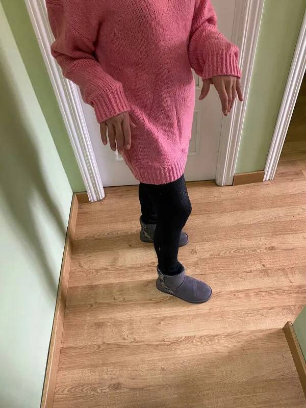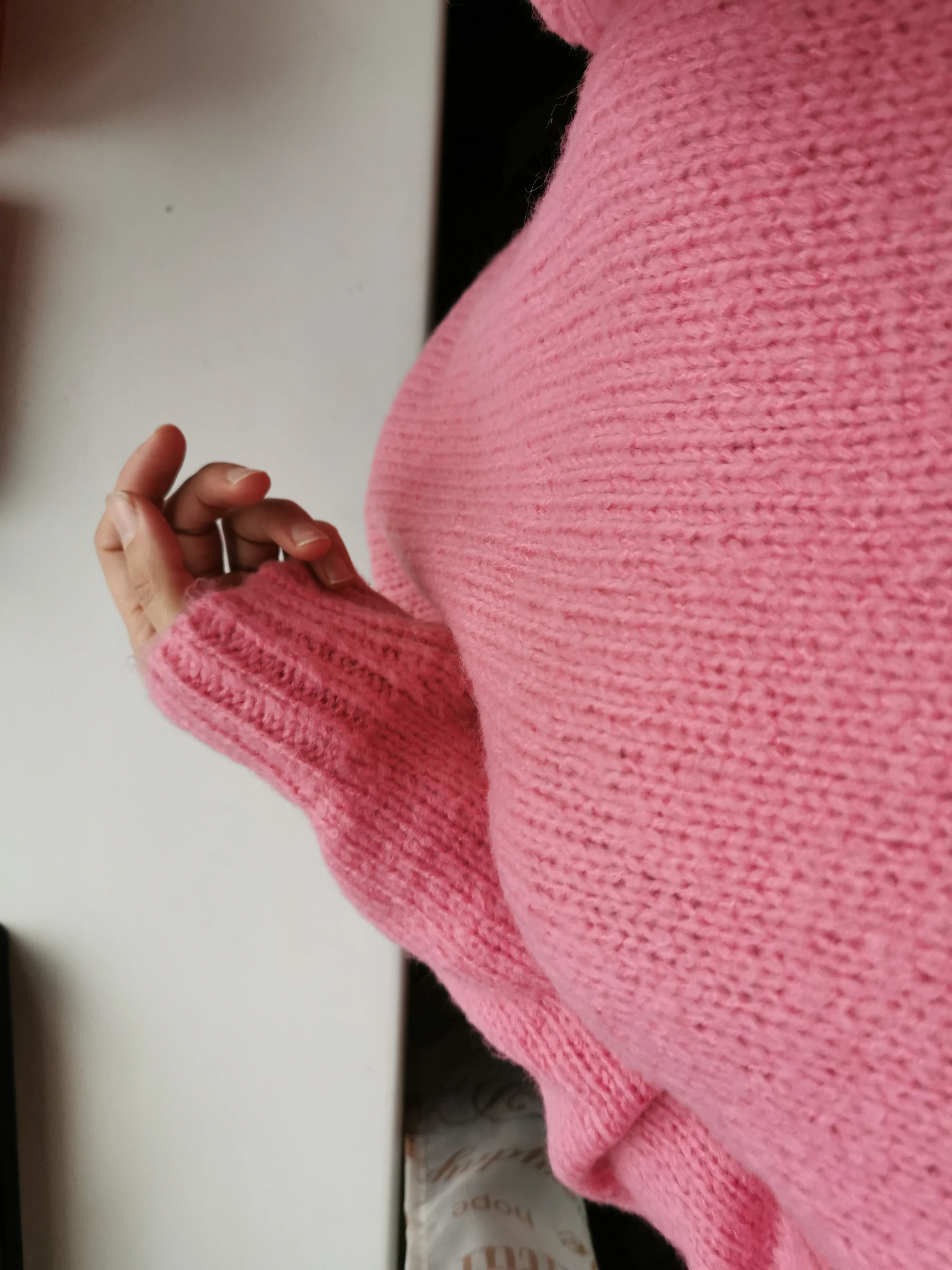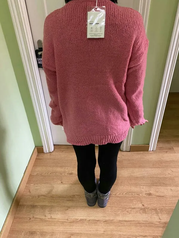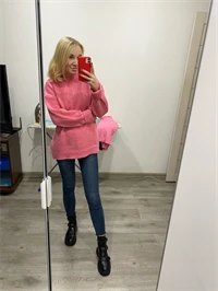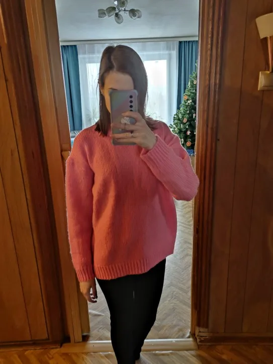 Доставка 2 wks курьером. Свитер не такой приятный, как на фото. Немного модно. У меня 168 см и 53 кг. Свитр для немного сзади и нужно закатать рукава. Цвет lososiowy.