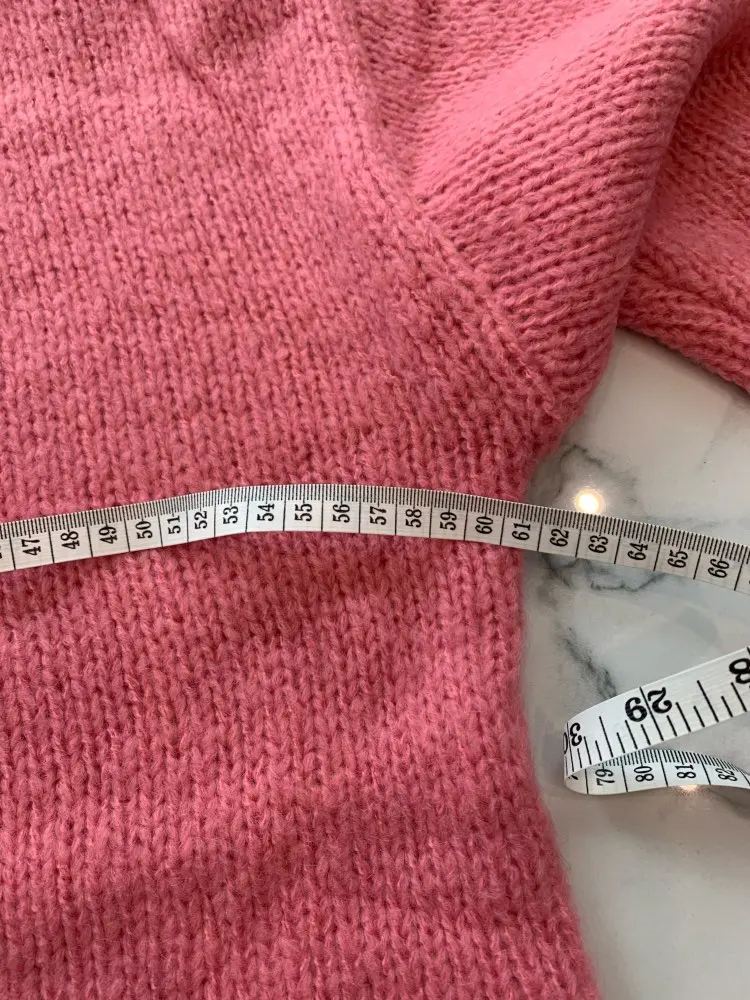 Приятный свитерок. На рост 162 42-44 р-р до середины бедра, есть небольшой запас по длине рукава. Сидит слегка оверсайз, но не так сильно, как на модели. Оттенок без "пыльной розы", больше розово-персиковый и чуть ярче.
