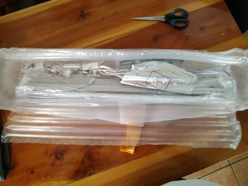 Пришла быстро, через транспортную компанию, упакована отлично, по фото видно. Элемент сам был заклеян защитной пленкой , но очень тонкой, а сторона обратная(она кстати металлическая , что огромный плюс) не заклеяна и немного исцарапана , что впринципе пофигу. в комплекте идёт 3м скотч и крепления с саморезами. Я сделал на 3м скотч с комплекта, кусочки маленькие,но держат отлично. Сенсор включения срабатывает как надо. Светит достаточно ярко, само то подсветить рабочую поверхность. Провода между лампами на папе-маме и весьма тоненькие , нужно с ними аккуратнее. Ну а так я доволен как слон, отличное приобретение