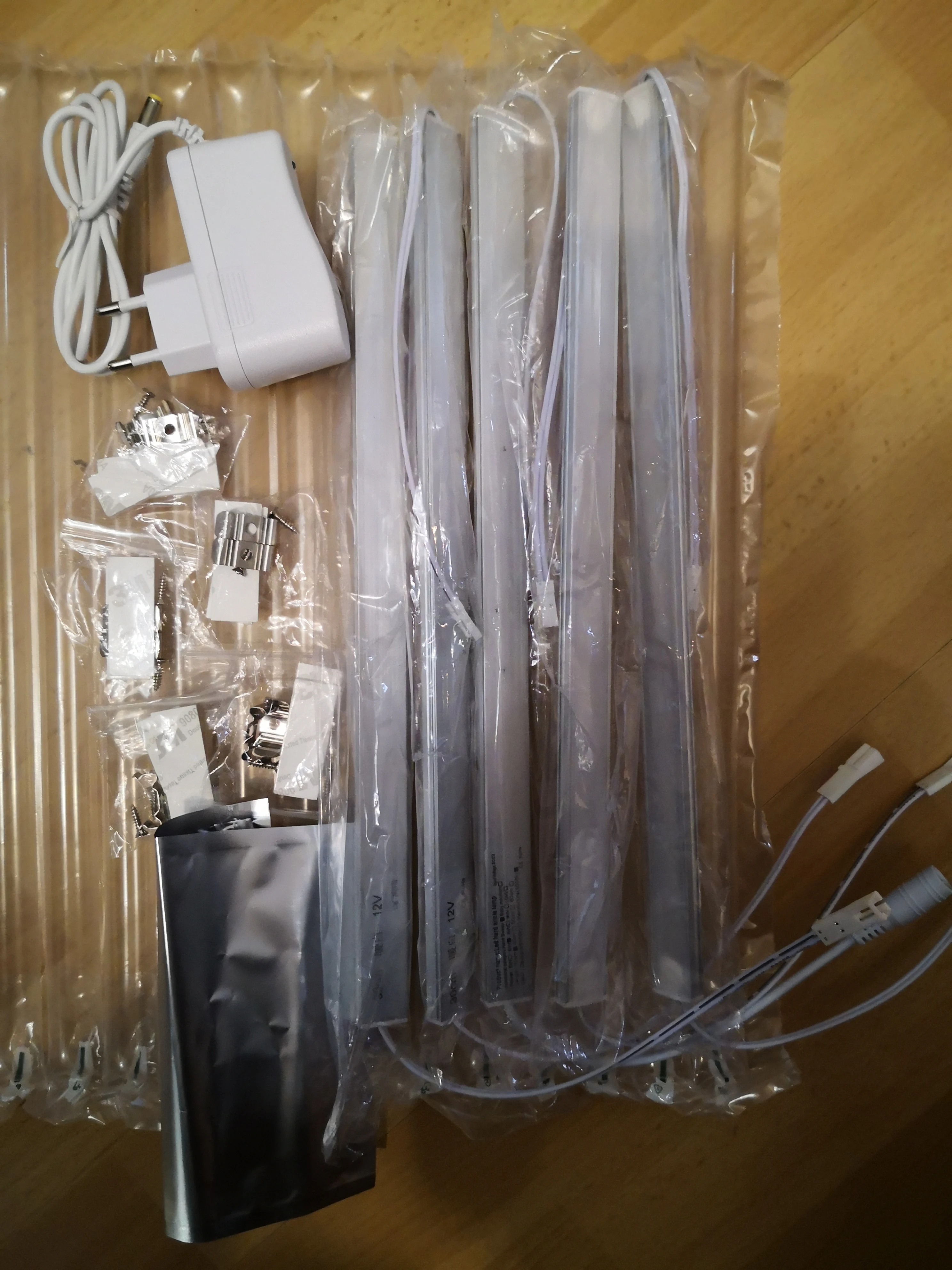 Товар пришел прекрасно упакованным. Заказывал комплект из 4 штук. В комплекте идет вилка-трансформатор на постоянный ток, 4 светильника, скотч 2сторонний марки 3m и крепежный комплект на 4 светильника. Сделаны светильники очень качественно, профиль алюминиевый, рассеиватель, соединяется между собой проводами с фишками. За эти деньги вариант просто шикарный, посоветовал паре друзей приобрести такие же.