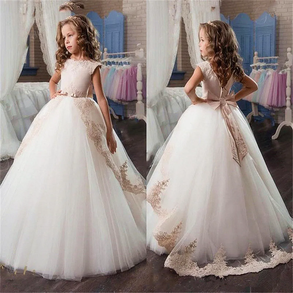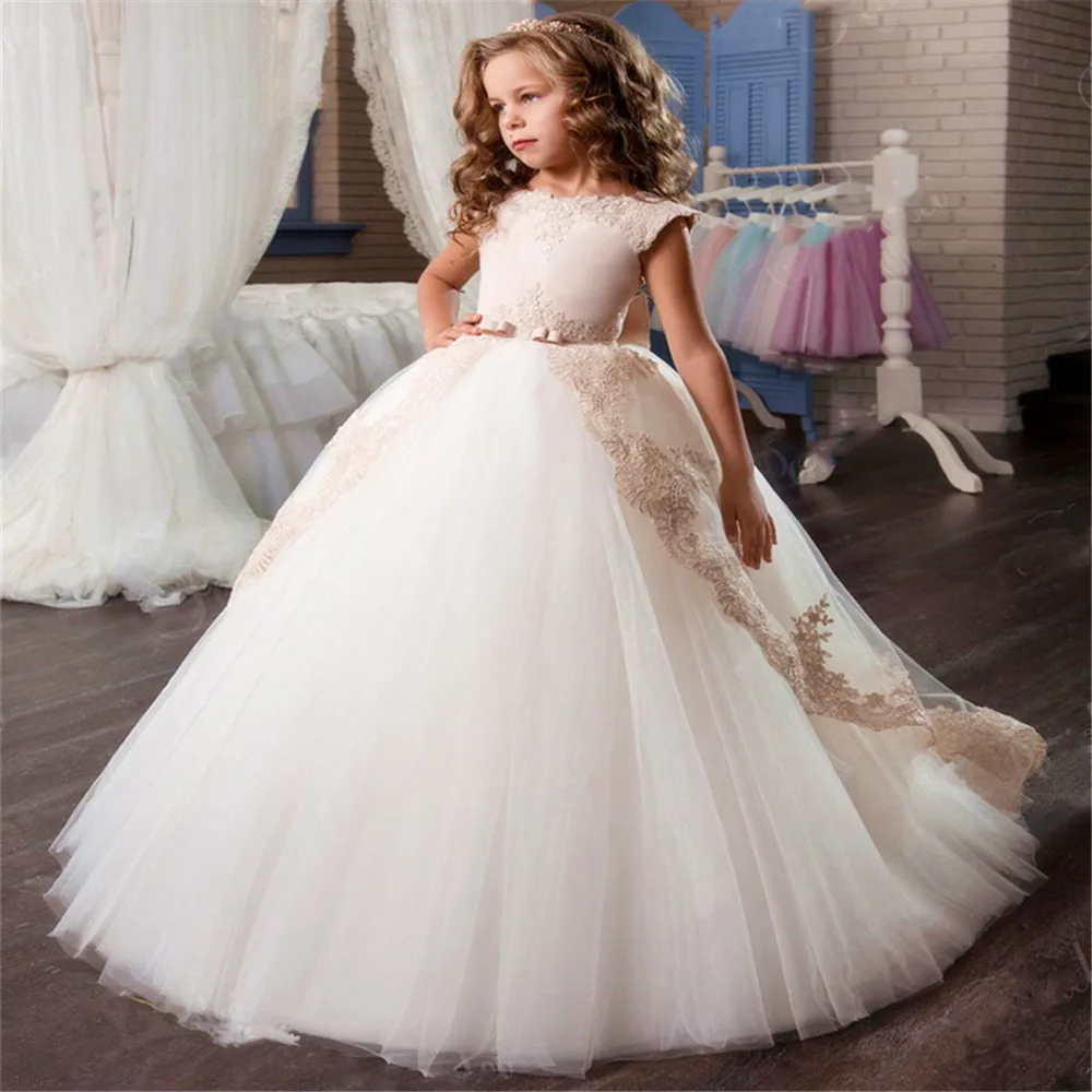 Платья для девочек цвета шампанского, с кружевным тюлевым бантом, б...