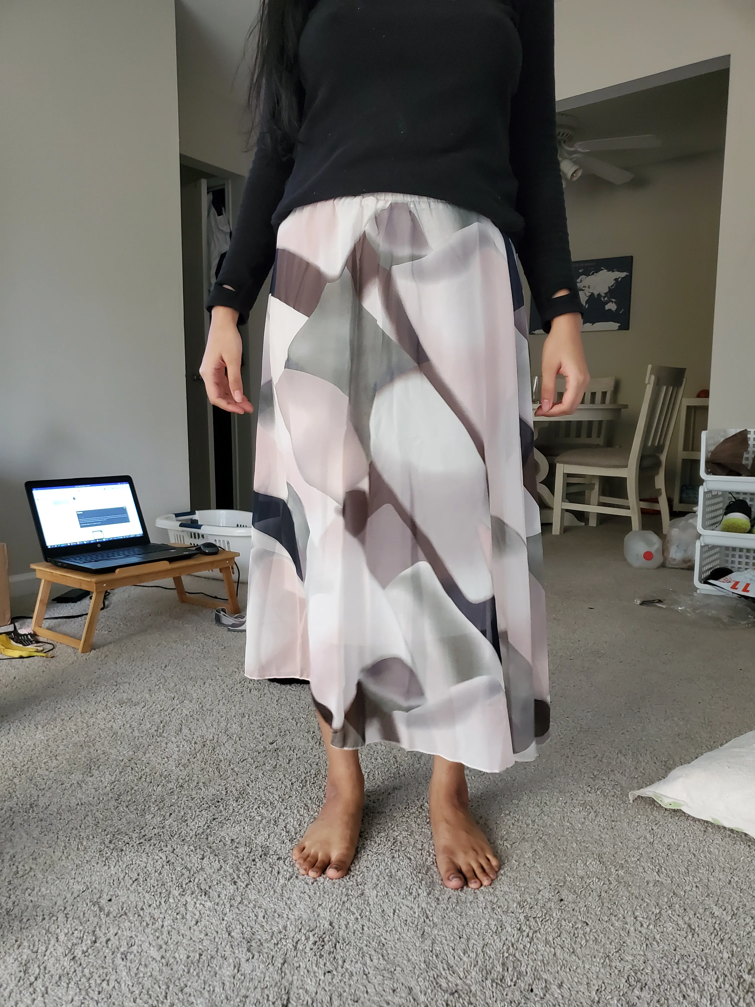 Юбка выглядит так же, как на картинке. Он прибыл очень быстро, и было немного резинки. До колена. Мне очень нравится резинка на талии. Под юбкой имеется тонкая ткань. Я Размер 4-6 или средний.