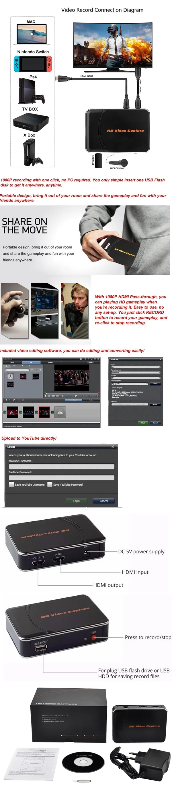 Подключение приложений к игровым консолям: -HDMI: WiiU, Xbox 360, Xbox One, PS4 -Носители информации: USB флэш-диск, портативный жесткий диск (формат exFAT не поддерживается) Разрешение: -Входное разрешение/Сквозное прохождение: 720x480 (60p), 720x576 (50p), 1280x720p (50p), 1280x720p(60p), 1920x1080 (50i), 1920x1080 (60i) 1920x1080 (24p), 1920x1080 (25p), 1920x1080 (30p), 1920x1080 (50p), 1920x1080 (60p) -Разрешение захвата: 720x480 (60p), 720x576 (50p), 1280x720p (50p), 1280x720p(60p), 1920x1080 (50i), 1920x1080 (60i), 1920x1080 (24p), 1920x1080 (25p), 1920x1080 (30p), 1920x1080 (25p), 1920x1080 (30p) -Формат записи: Видео/AVI MP4, аудио/AAC стерео -Качество записи: максимум 18 Мбит/с при 1080P 30 кадров в секунду -Файл записи: максимум 2 ГБ/на файл -Место записи: макс. 140 МБ/мин, 8,4 Гб/час -Источник питания: 5 В постоянного тока, 2 А Посылка 1*1080P HDMI захват игр 1 * блок питания 1 * Руководство 1 * компакт-диск с программным обеспечением для редактирования видео Примечание: 1.PS3/PS4 отключила HDCP для прошивки 1,7 или более поздней версии, поэтому Пользователь может легко записывать игры с помощью ezcap HDMI game Capture. 2. Используется на PS3/PS4/XBOX360 blue-ray dvddirect С микрофонным входом для записи вашего голоса.