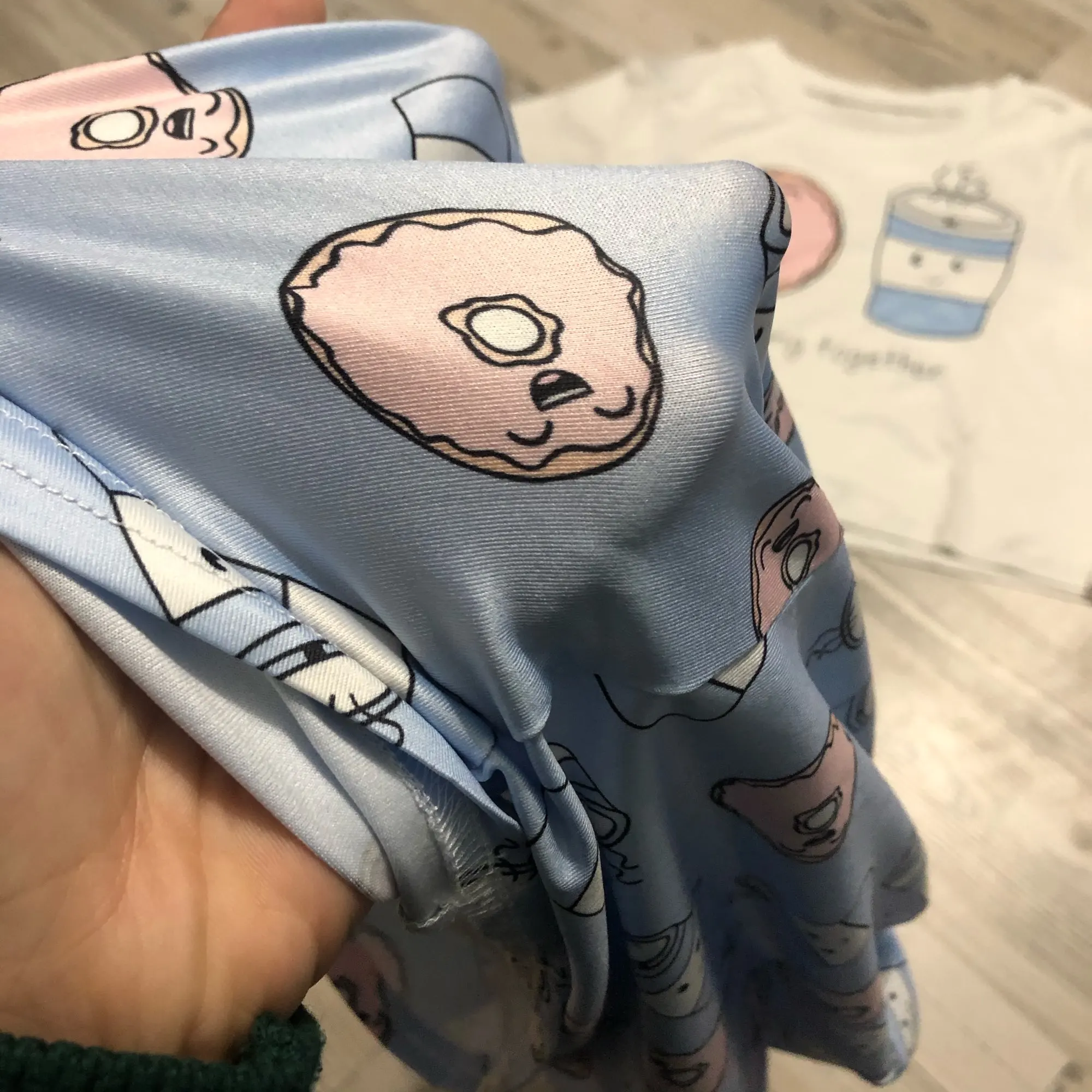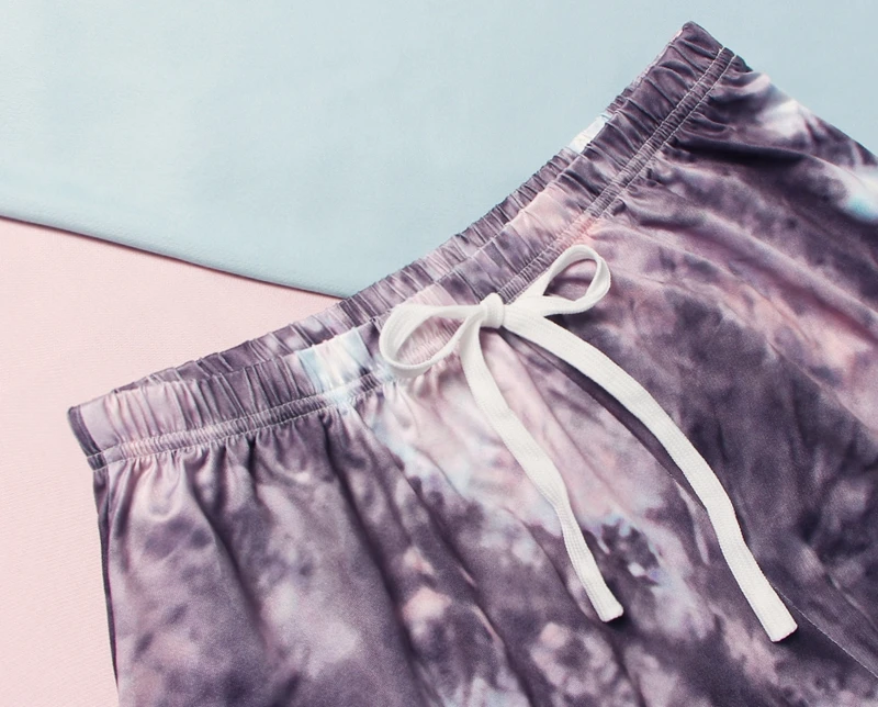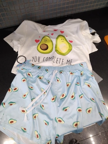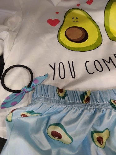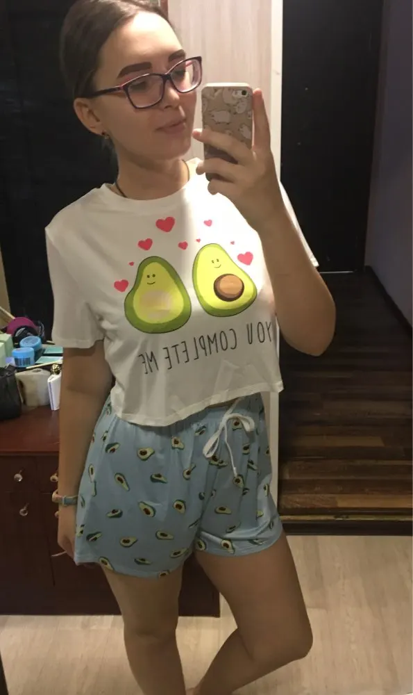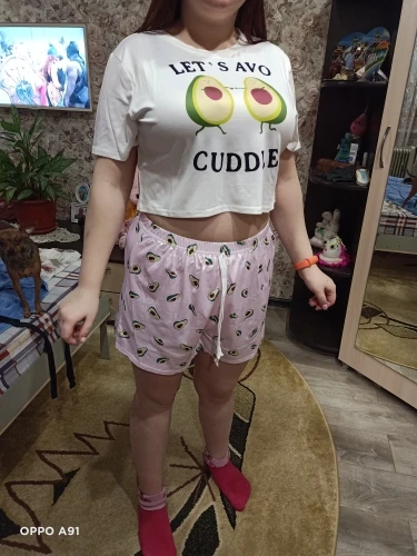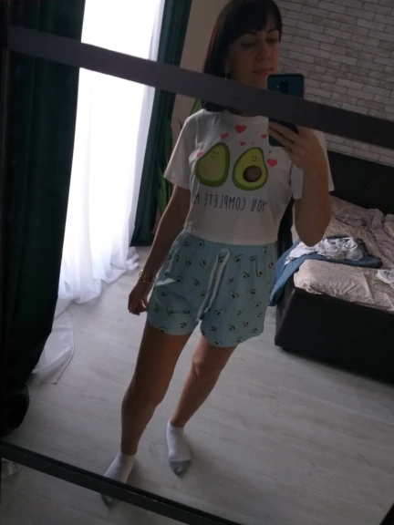 Очень милый комплект. Синтетика, но мягкая, не электризует. Удобно и симпатично. Рисунок чёткий и яркий, без косяков. Никаких ниток, зацепок нет. Все чётко. Запах был небольшой кисловатый клеевой, но после стирки все ушло. Завязки на шортах чистый декор, никак не связаны с резинкой