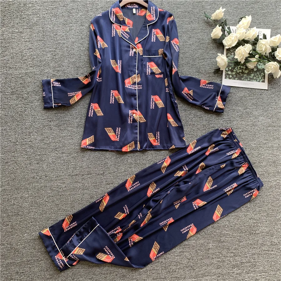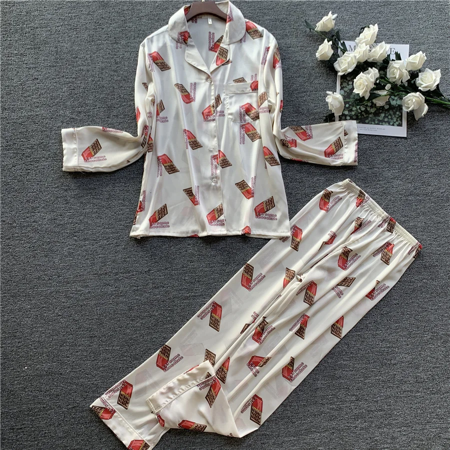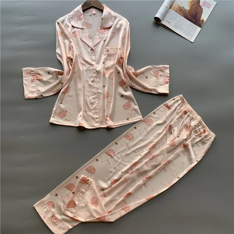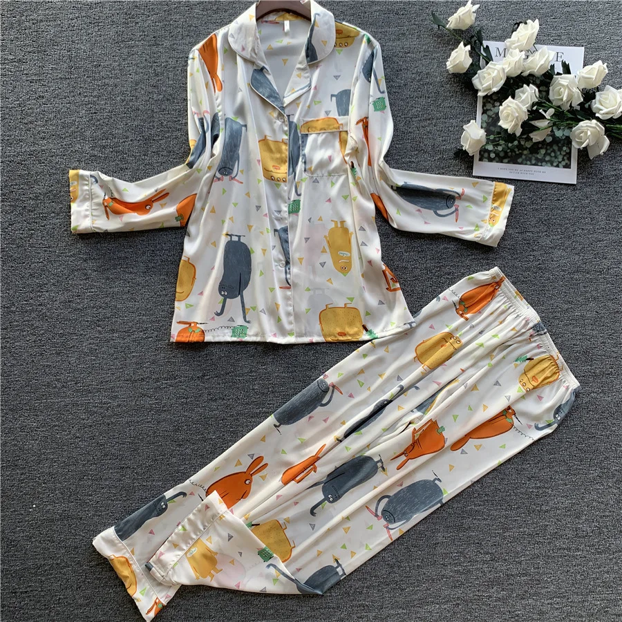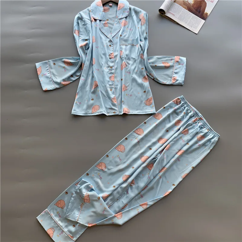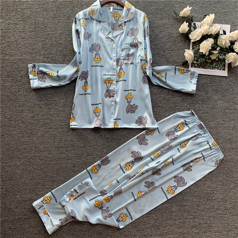 Lisacmvpnel женская пижама из натурального шелка с длинными рукавами, комплект брюк, пижамный комплект, атласная пижама с мультяшным принтом