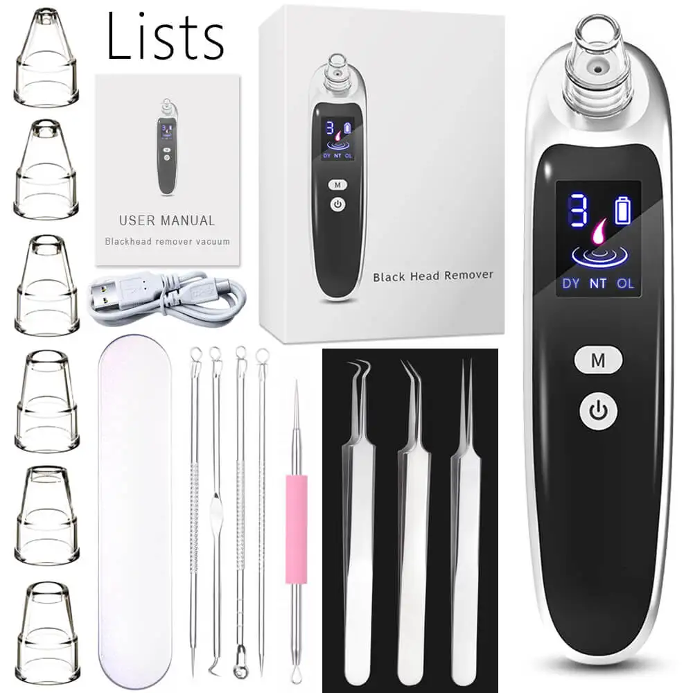 Особенности: 1. Удаление угрей, Чистка Пор, 3 режима подходят для всех типов кожи 2. Имеется 6 сменных всасывающих головок для решения различных проблем кожи 3. С usb-кабелем для зарядки, последние 180 минут на одной зарядке. Светодиодный визуальный дисплей, индикация заряда батареи и сила всасывания с первого взгляда Посылка: 1 х вакуумный прибор для удаления угрей 6 зондов для отверстий 1 x USB кабель для зарядки 1 x Руководство пользователя 1 х упаковочная коробка 8 шт., игольчатые инструменты для удаления акне