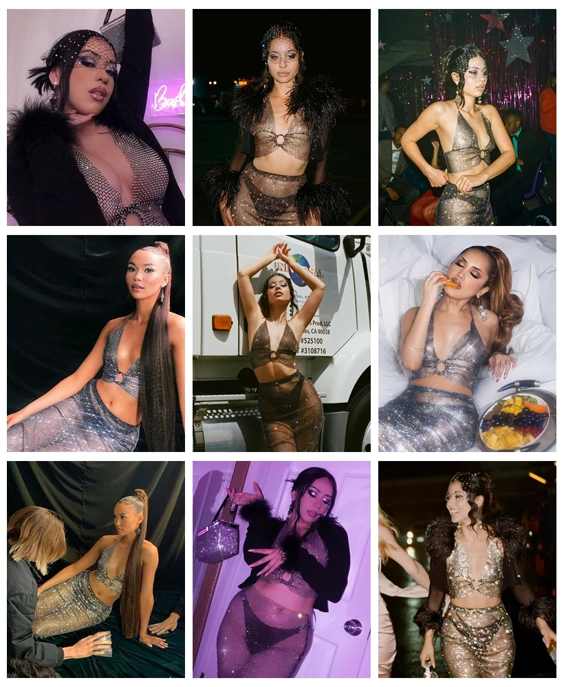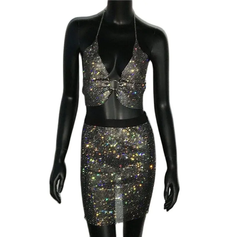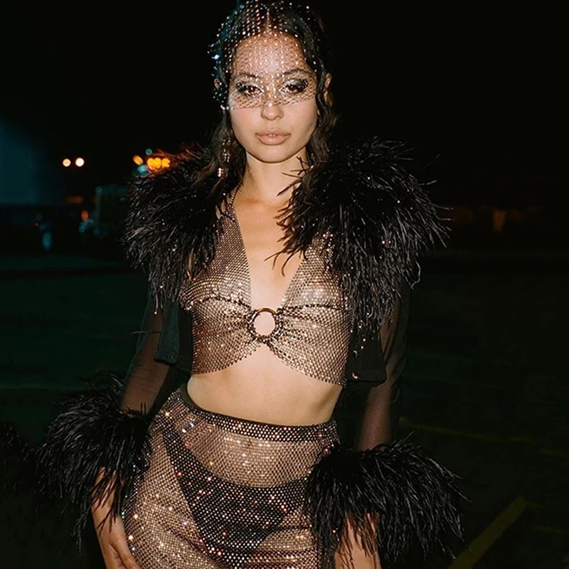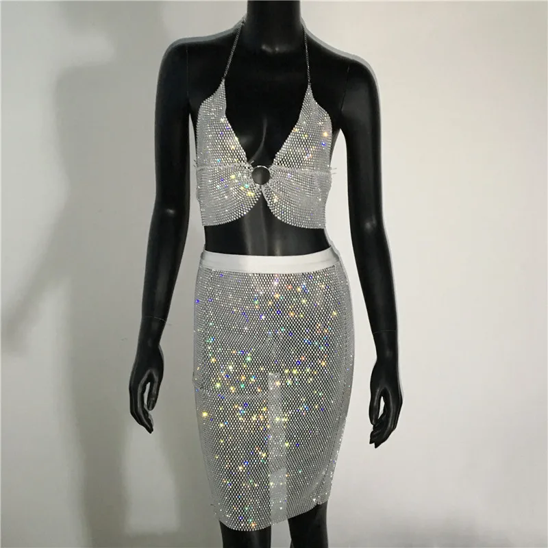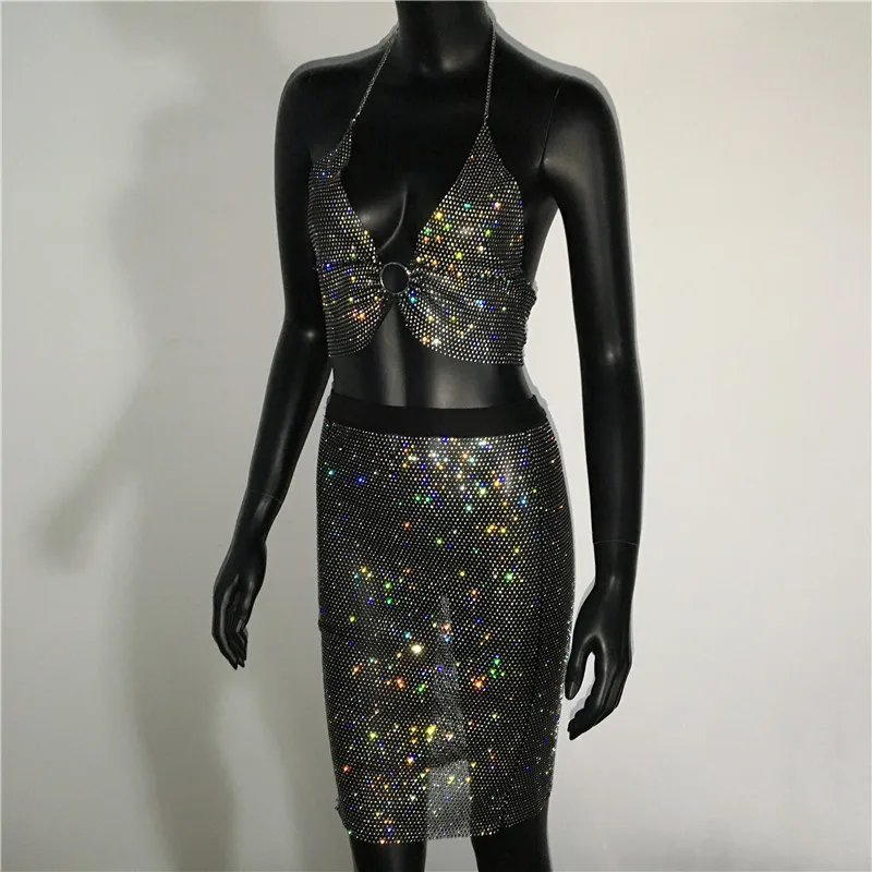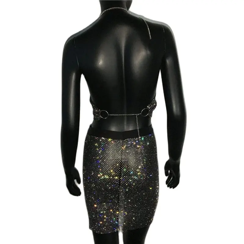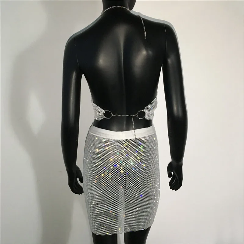 Женский прозрачный топ на бретелях, блестящий укороченный топ со стразами, круглое металлическое кольцо открытой спиной, с глубоким вырезом, для ночного клуба