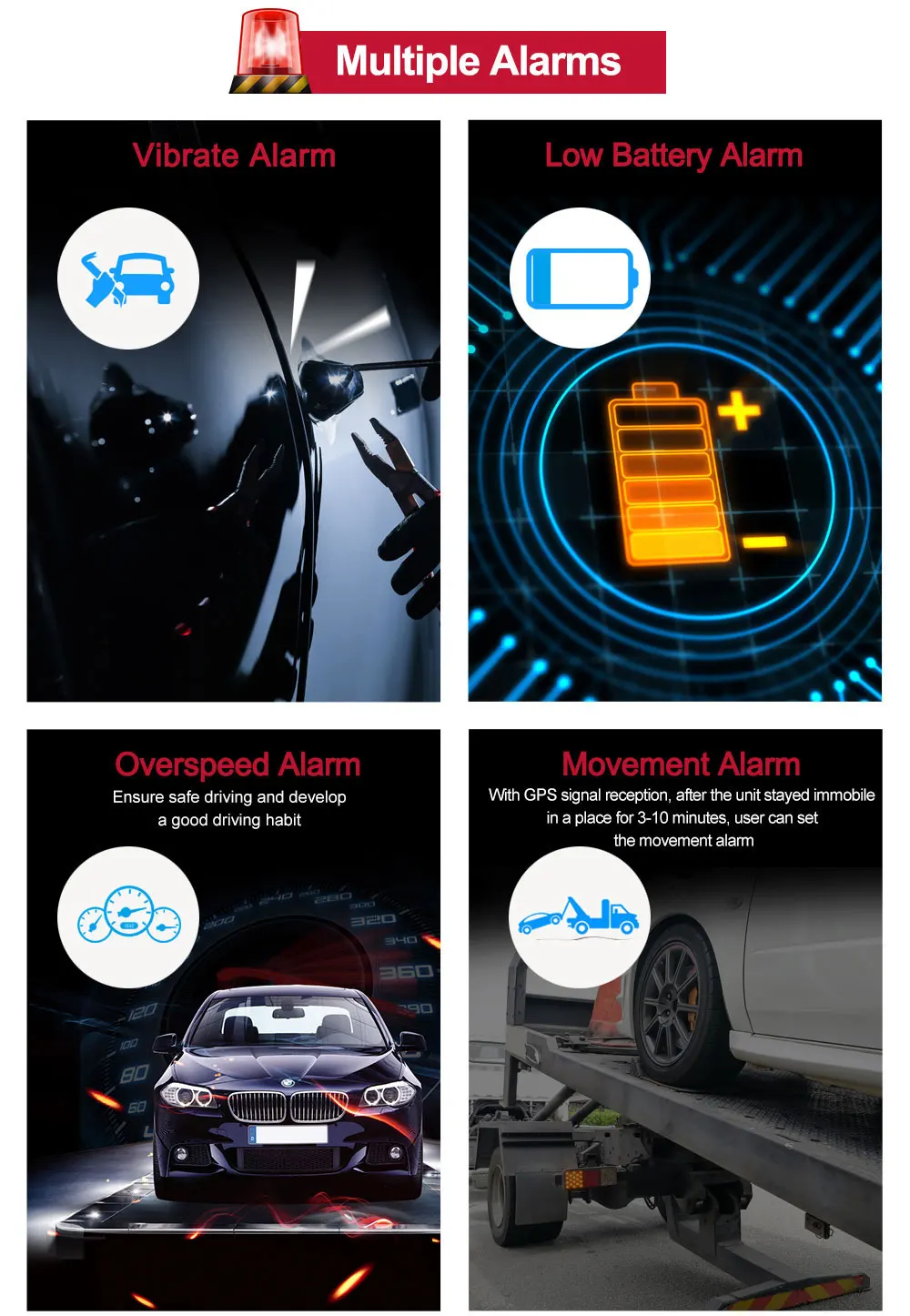 1. GPS + LBS + WIFI три способа позиционирования: если gps-сигнал хороший, устройство будет размещаться через gps-спутник, если нет, устройство будет обнаружено через LBS! При режиме определения местоположения GPS Точность составляет 5-10 метров, при режиме определения местоположения LBS Точность составляет 100-2000 метров, при режиме определения местоположения WIFI точность 0-50 метров. 2. Отслеживание в реальном времени: вы можете отслеживать устройство в реальном времени на картах google через мобильный телефон, планшет и компьютер, и интервал загрузки данных minumum составляет 10 секунд! 3. Воспроизведение маршрута истории: приложение и веб-сервер могут записывать данные загрузки устройства до 6 месяцев, вы можете воспроизводить маршрут истории в любое время! 4. Длительная продолжительность работы в режиме ожидания: он имеет встроенный 3,7 V 6000 мА/ч, литий-ионный аккумулятор, время работы в режиме ожидания: до 100 дней, а время работы составляет до 9-13 дней; 5. Мощный магнитный: он имеет встроенные мощные магниты, может быть очень легко установлен. 6. Водонепроницаемый IP67: водонепроницаемый уровень этого устройства IP67, он может противостоять брызгам воды, но не может быть помещен под воду! 7. Сверхскоростная Сигнализация: Эта сигнализация работает только в режиме непрерывного позиционирования. Когда скорость устройства превышает ту скорость, которую вы указали, она отправит сообщение «Будильник скорости!» К номеру admin каждые 5 минут. 8. Ударная Сигнализация: после того, как вы сделали сигнал тревоги, пожалуйста, держите трекер неподвижным в течение 5 минут, тогда эта функция начнет работать. Он отправит SMS «датчик тревоги!» на номер admin, когда устройство будет в шоке. 9. Будильник Движения: когда устройства остаются неподвижными в месте в течение 10 минут, пользователь может настроить будильник движения с помощью этой команды «move + passord», затем в чехол устройство переместило 500 м он отправит сигнал тревоги SMS «сигнализация, отслеживающая движение + широта и долгота» на авторизованный номер. 10. Гео-забор: Настройте геофенс для отслеживания для ограничения его движений в пределах района. Устройство отправит информацию о тревоге в приложение и веб-сервер, когда он выходит из этого района или попадает в него. 11. Режим сна для экономии заряда батареи: * Режим сна в зависимости от времени: после этого трекер будет работать только в течение 5 минут после пробуждения и возврата в режим сна, GPS отключится, и GSM будет работать в режиме низкого потребления. SMS, звонок может разбудить трекер. * Режим сна с помощью датчика удара: после этого настройки, если нет шока в течение 5 минут, трекер будет работать под режимом «Сон шоком», GPS отключится, GSM будет работать при низком потреблении. Вибрация, SMS, звонок может разбудить трекер. 12. Аварийный сигнал: на задней стороне устройства имеется индукционный датчик против удаления. Если этот скрытый индукционный датчик не будет закрыт снова, устройство отправит «сигналы тревоги от потери!» на номер admin и номер SOS по SMS! 13. Веб-платформа отслеживания и мобильное приложение: срок службы бесплатно! Доступны веб-сервер и Приложение iOS и Android версии!