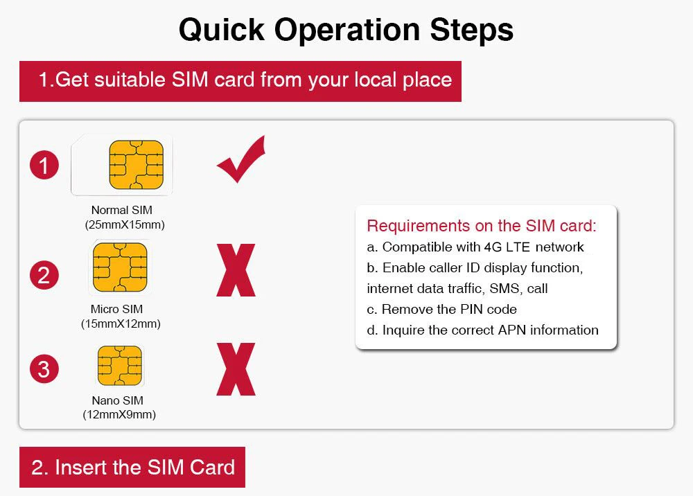 A: * Пожалуйста, получите подходящую sim-карту для этого gps-трекера, sim-карта должна быть совместима с сетью 2G GSM и должна быть обычной sim-картой; * Пожалуйста, включите «GPRS Интернет-трафик данных» и «дисплей идентификатора звонящего» функции sim-карты * Пожалуйста, убедитесь, что sim-карта имеет достаточный баланс и удаляет пин-код; * Пожалуйста, получите эту информацию от поставщика sim-карт: Имя apn, имя пользователя apn, пароль apn, номер MCC, номер MNC.
