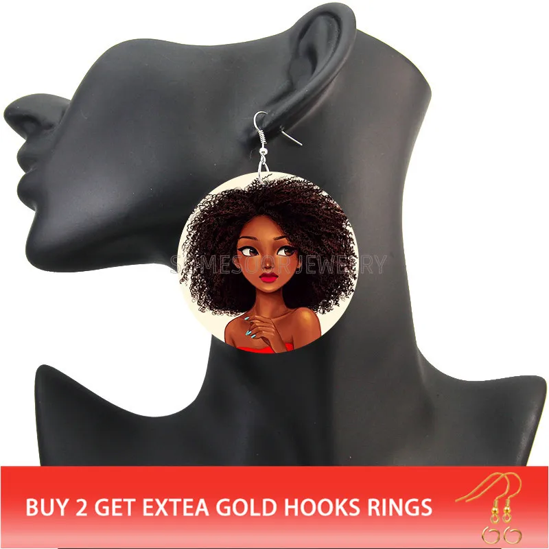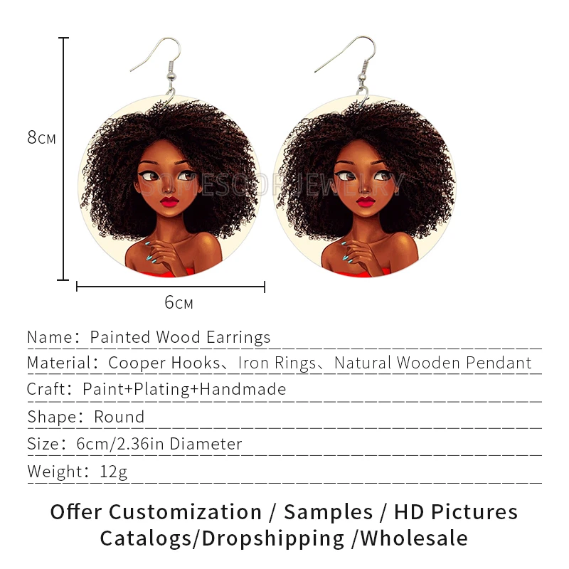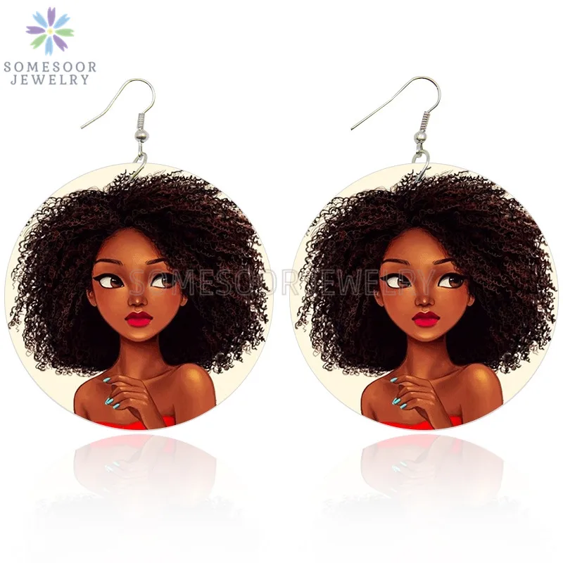SOMESOOR напечатанные Черные милые девушки вьющиеся волосы африканская древесина Висячие серьги афро Artstic окрашенные деревянные висячие ювелирные изделия для женщин Подарки