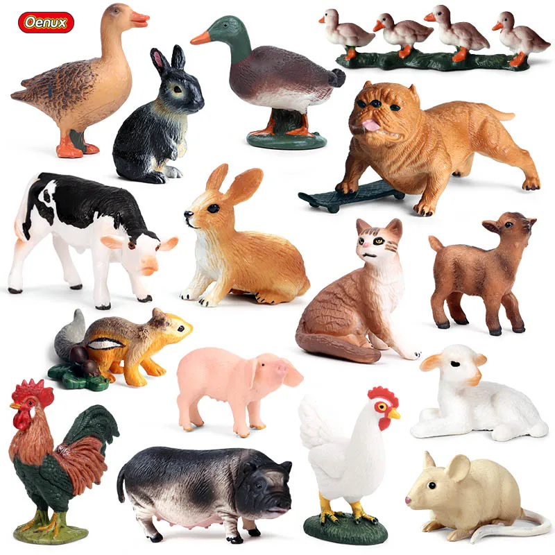 Характеристика:Oenux Милая птица гусиная Утка Курица поросенок корова Кошка Ферма животные Модель Фигурки ПВХ миниатюрные Развивающие игрушки для детей