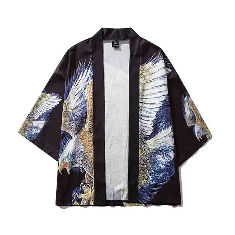 Кимоно мужское с принтом в японском стиле, рубашка в стиле хип-хоп, юката, Харадзюку, атласный Повседневный Кардиган оверсайз, халат, черный