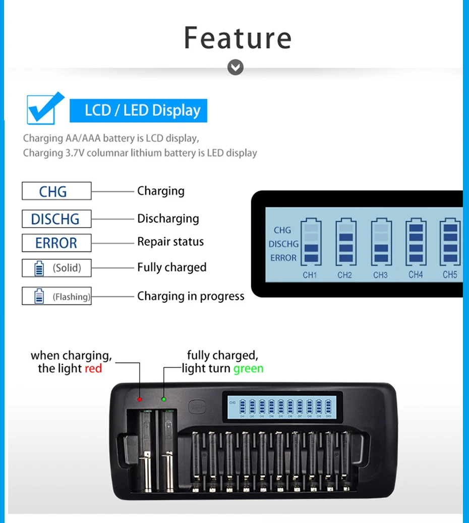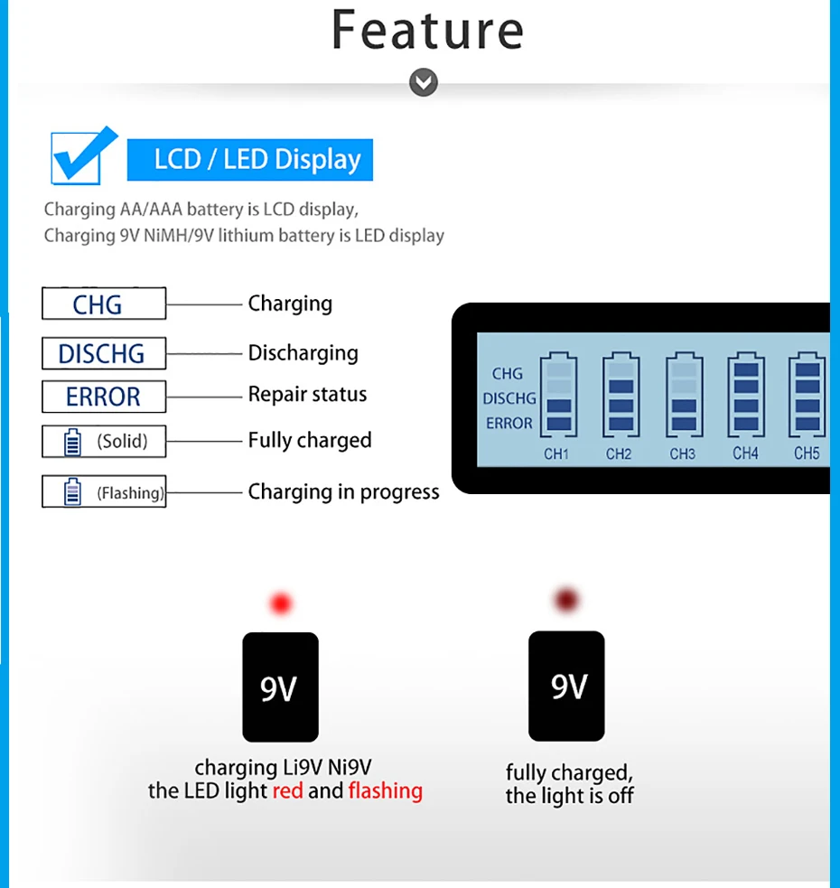 Зарядное устройство впринципе не плохое,умное,понравилось то что оно умеет разряжать ni-mh/ni-cd аккумуляторы до 0.9v это нужная опция для тренеровки от эффекта памяти которым свойственно возникать данным типам акб. Жаль,но пришлось сделать возврат,т.к. мой экземпляр почемуто не заряжает эти аккумуляторы, а li-ion заряжает без проблем. Странно, продавец из китая всячески отбрыкивался от возврата,даже мотивируя тем что зарядник не умеет заряжать ni-mh батареи. Я просто в шоке был от такого недоразумения! Ведь и на сайте и в инструкции чёрным по белому написано для чего предназначено данное зарядное устройство и с какими аккумами оно работает. Спасибо аллиэкспресс что пошли на уступки и помогли вернуть половина стоимости устройства (можно было вернуть всю стоимость,но тогда девайс надо было отправить в китай,а отправка из РФ согласно прейскуранта цен почты стоит прилично).
