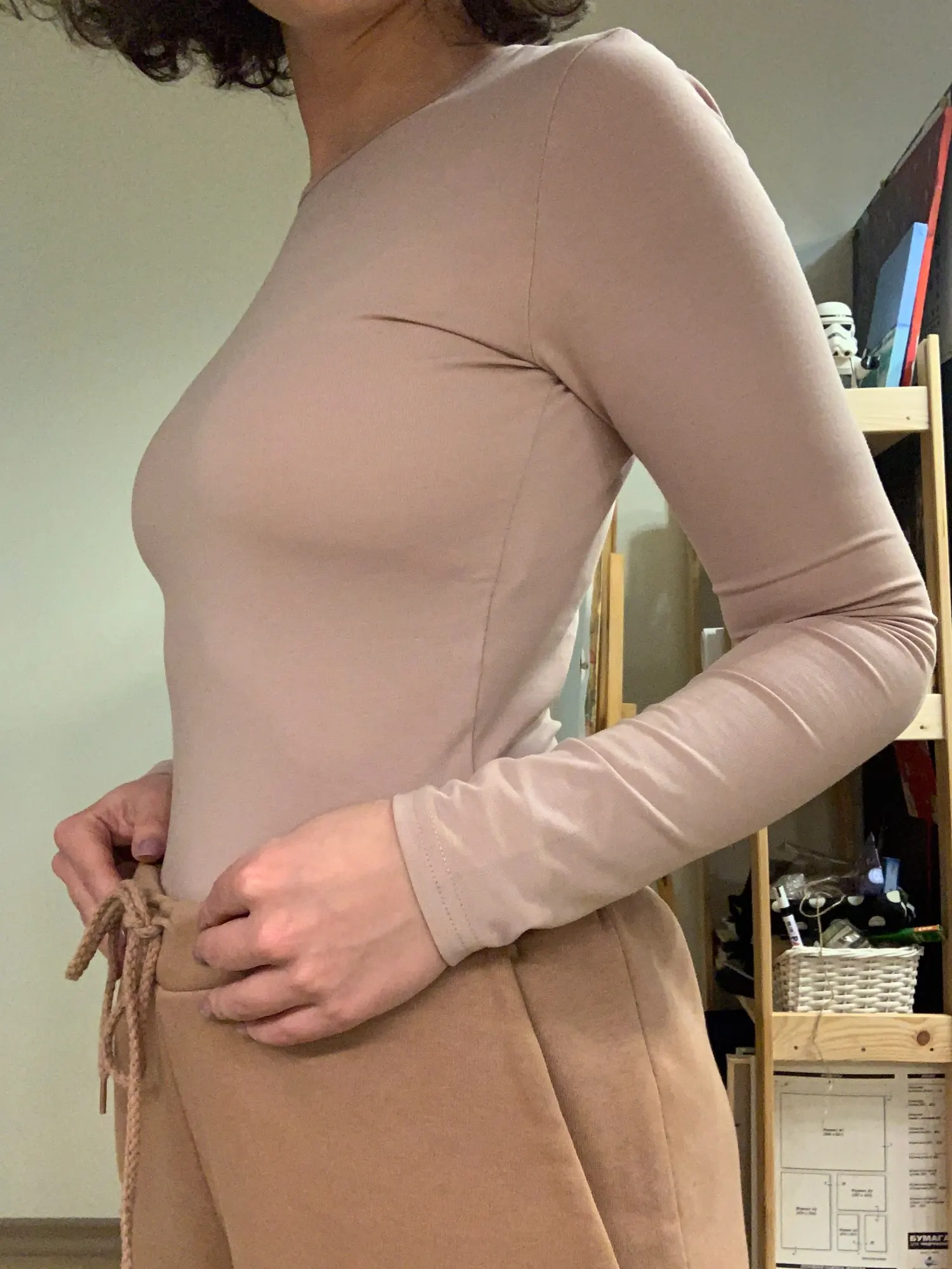 Быстрая доставка 2 недели. Качественное боди, хлопок со спандексом. Довольно плотное, облегает. Рукава длинные. На рост 173 размер Л по телу хорошо, не впивается в бедра. Цвет беж розе пудра Брала под вязаное зимнее платье с открытой спиной. Хорошо будет под брюки с пиджаком оверсайз.